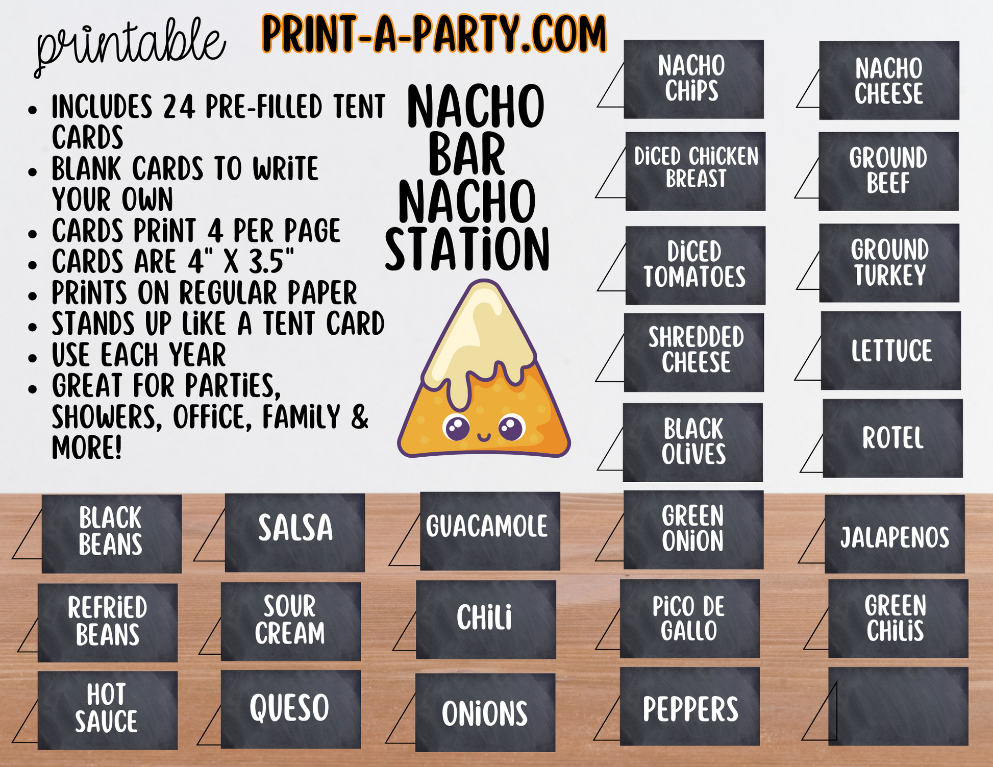 The pre-filled tent cards included are the following: Nacho Chips, Ground Turkey, Diced Chicken Breast, Ground Beef, Shredded Cheese, Nacho Cheese, Hot Sauce, Queso, Green Onion, Lettuce, Black Olives, Pico De Gallo, Jalapenos, Refried Beans, Black Beans, Guacamole, Chili, Salsa, Sour Cream, Rotel, Diced Tomatoes, Green Chilies, Onions and Peppers.  Print as many or as few as you need for your setup. A blank page of tent cards is also provided so you can add your own.