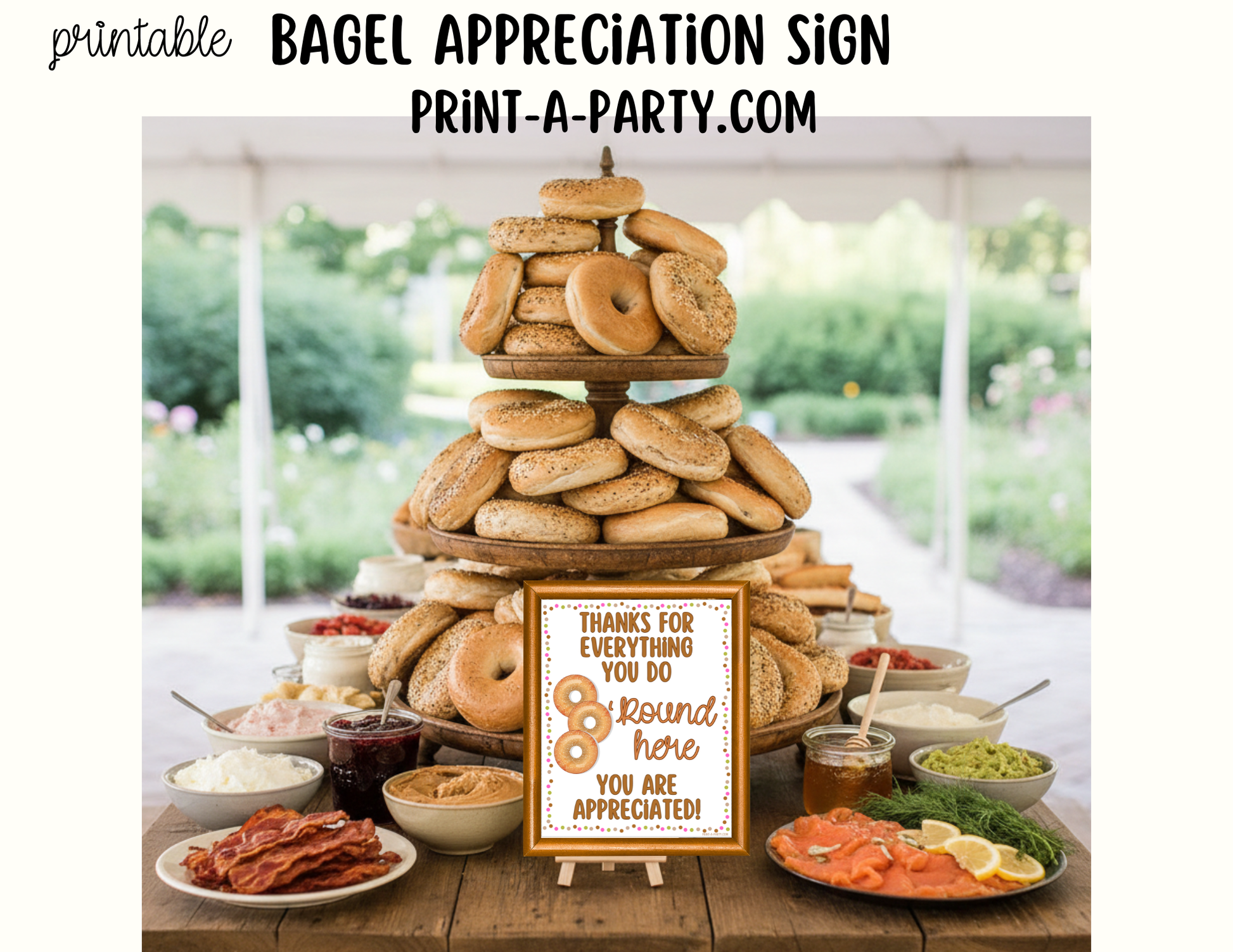 Add a warm and thoughtful touch to your bagel bar with this Printable Bagel Appreciation Sign! Designed to make your display feel polished and inviting, this 8x10 sign is perfect for celebrating and recognizing the amazing people in your life—teachers, staff, employees, volunteers, church groups, and more. With a cheerful message that reads: “Thanks For Everything You Do ’Round Here – You Are Appreciated!”, it’s an easy way to elevate any appreciation event.