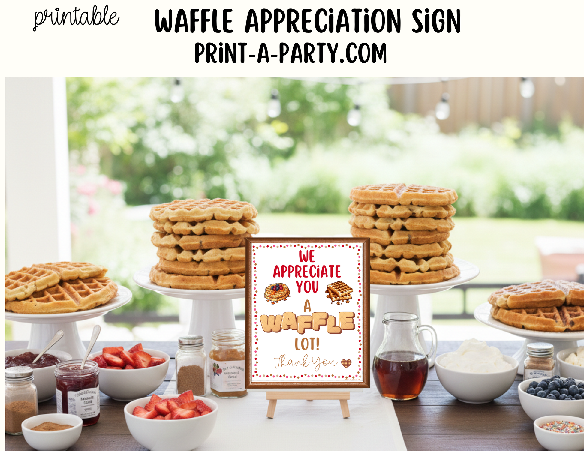 Add a warm and whimsical touch to your appreciation event with this Printable Waffle Bar Sign! Featuring the charming message “We Appreciate You A Waffle Lot! Thank You!”, this 8x10 sign is the perfect way to honor employees, teachers, volunteers, staff members, PTO groups, and more.