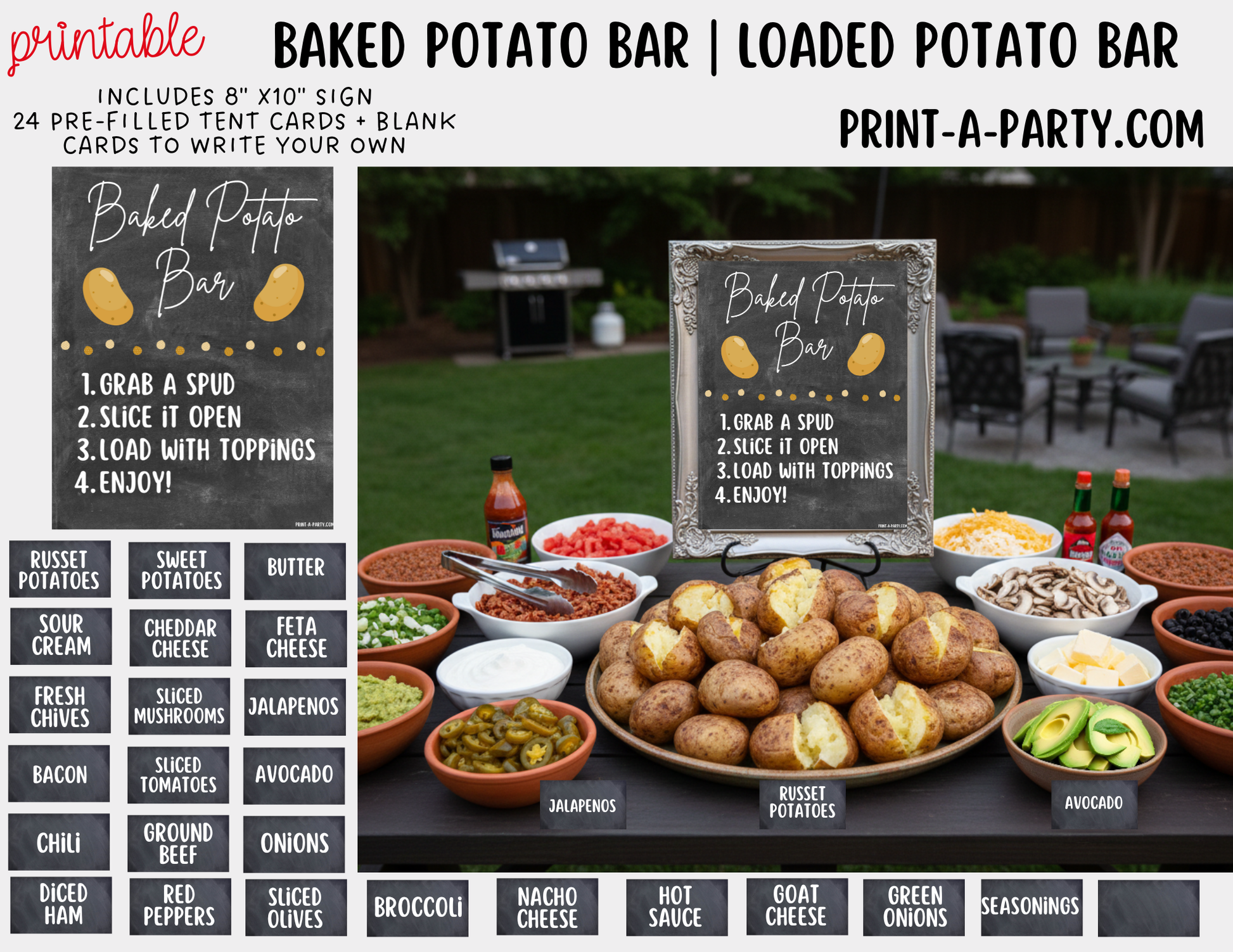 - Includes 8x10" Baked Potato Bar sign (prints on 8.5" x 11" paper) in Chalkboard and White designs