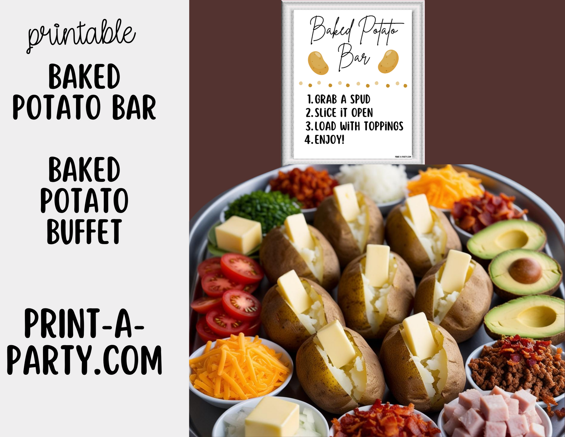 Editable version available here: Editable BAKED POTATO BAR - Sign and Food Labels Template White - Perf – PrintAParty