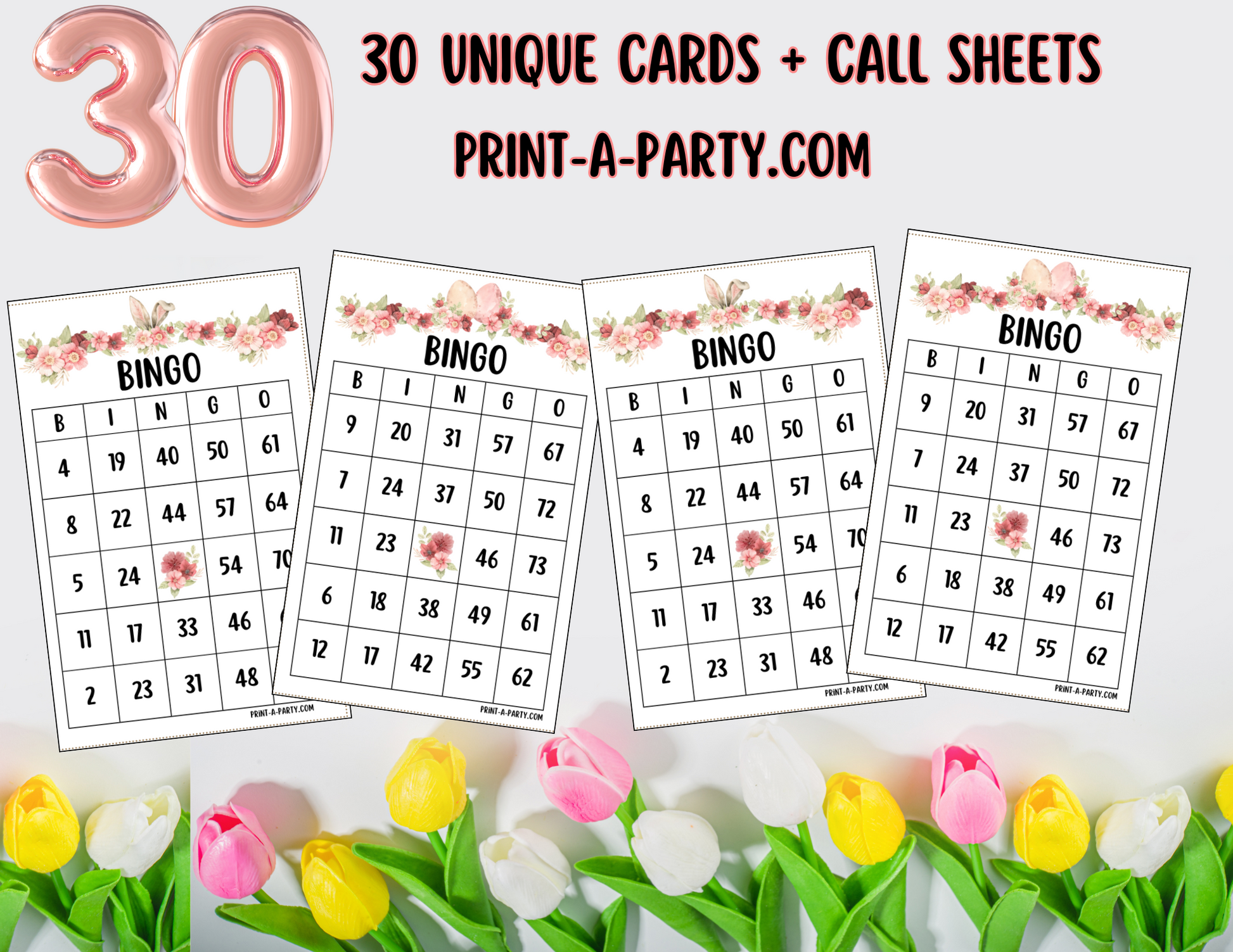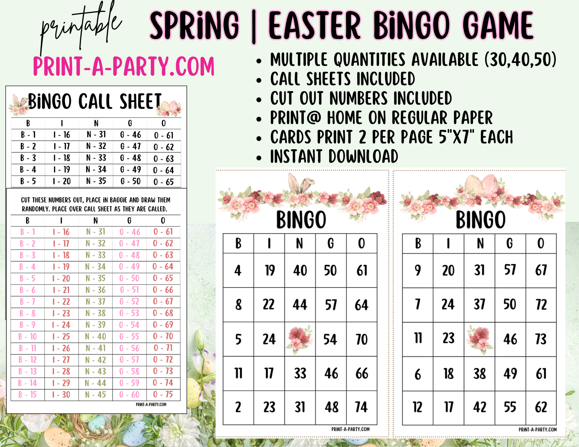 Transform any springtime event or party into a vibrant and exciting experience with our delightful Spring floral/Easter-themed BINGO game! Ideal for spreading happiness and creating memorable moments with kids, loved ones, or students. Beautiful spring florals with a subtle Easter design. Choose from 30, 40, or 50 beautifully designed cards that can be easily printed on standard paper. The games are neatly formatted with 2 cards per page, each measuring 5x7 inches. And don't worry, we've included call sheets with number cut-outs for effortless calling!