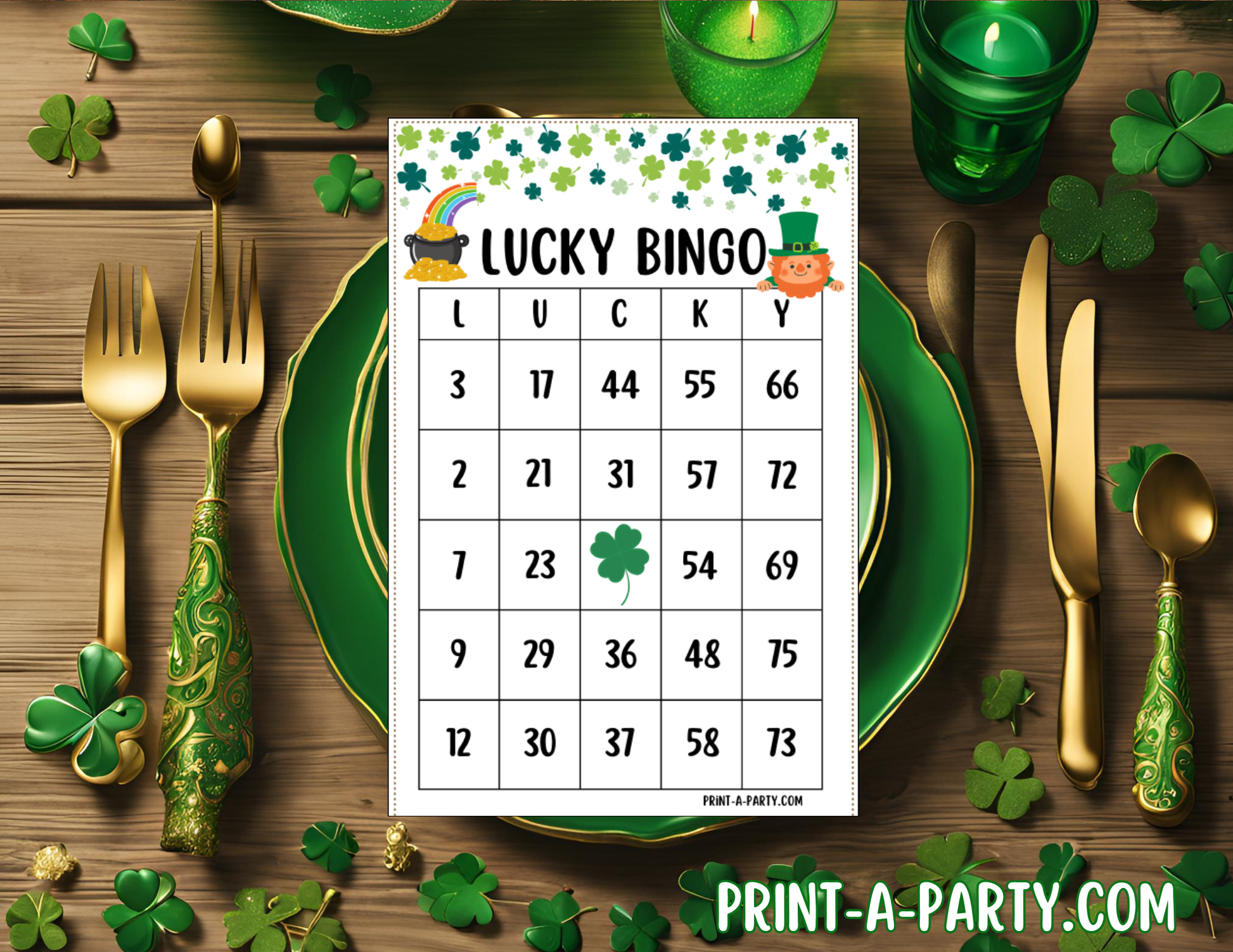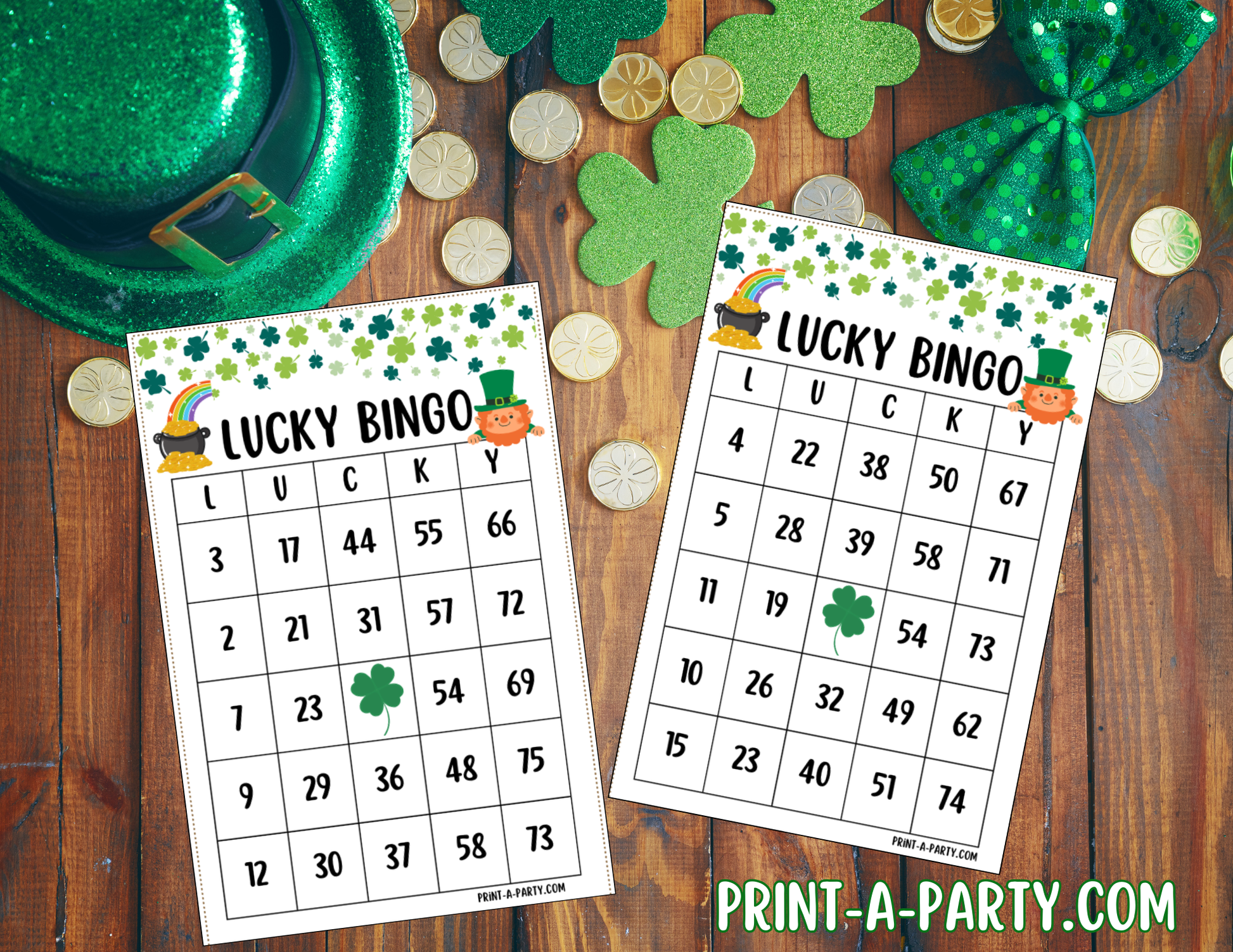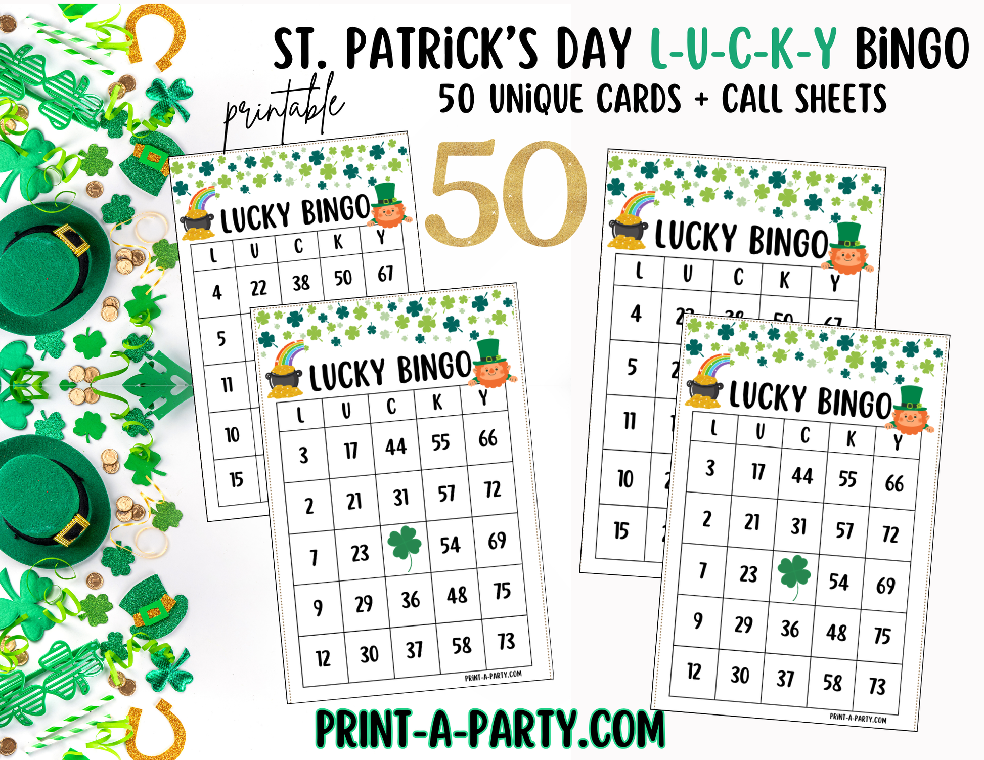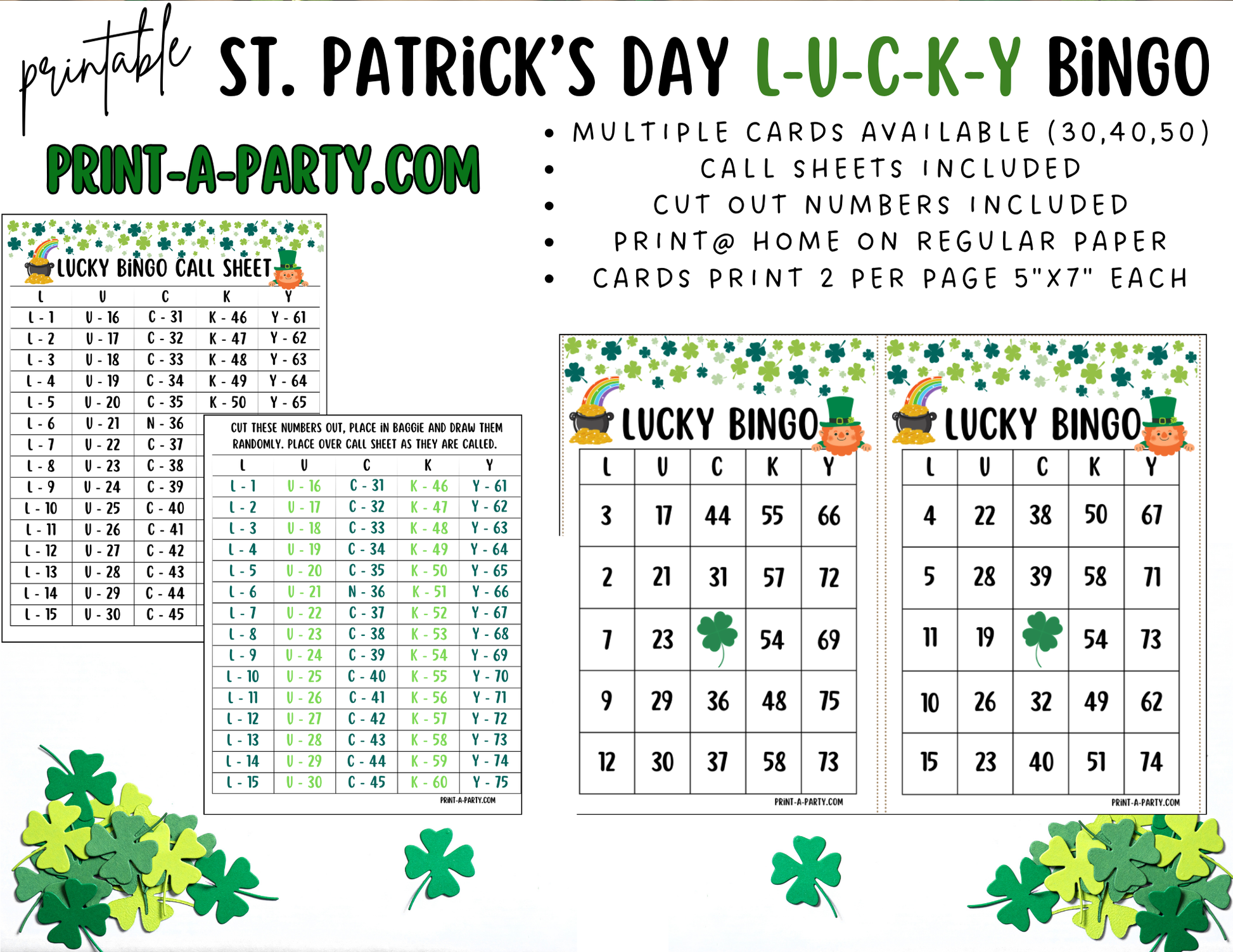 Celebrate St. Patrick's Day with a printable game of L-U-C-K-Y Bingo! This fun twist on traditional BINGO will bring the luck of the Irish to any event. With 30, 40, or 50 unique cards to choose from, you can create a memorable experience for kids, parties, or classrooms. The game is played the same way as traditional BINGO, but with a festive St. Patrick's Day twist. Each set includes randomly numbered Bingo cards, a Bingo call sheet, and a page of call numbers for easy playing. Don't wait - download now for instant fun! Cards and call sheets print on regular paper - and games print 2 per page measuring 5x7" each. Dotted lines make it easy to cut out.