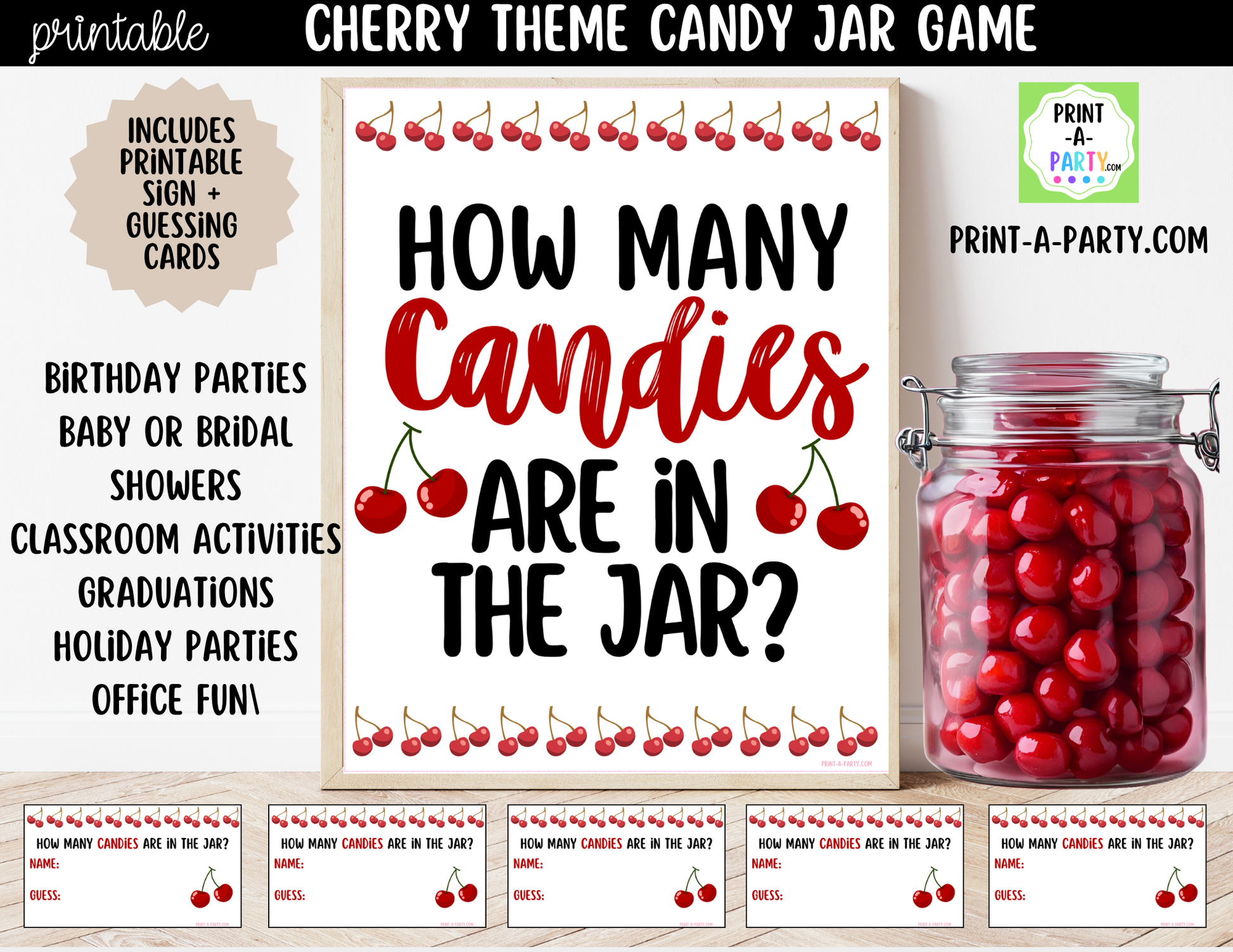 Cherry Theme Candy Jar Guessing Game Printable Sign (8x10) + Guessing Cards - Party Game Decor