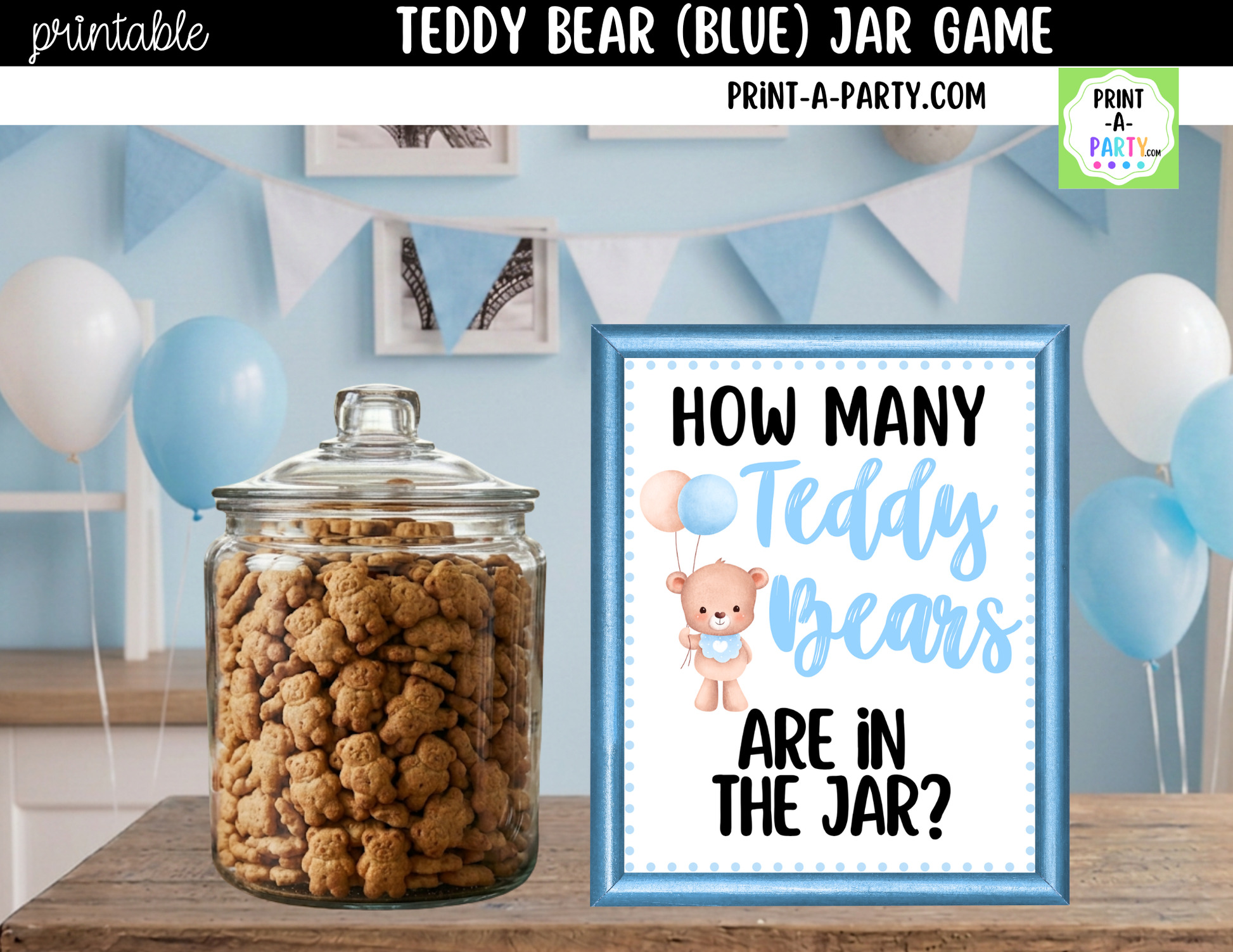 Teddy Bears (blue) Jar Game Printable Sign (8x10) & Guessing Cards for Baby Shower or parties