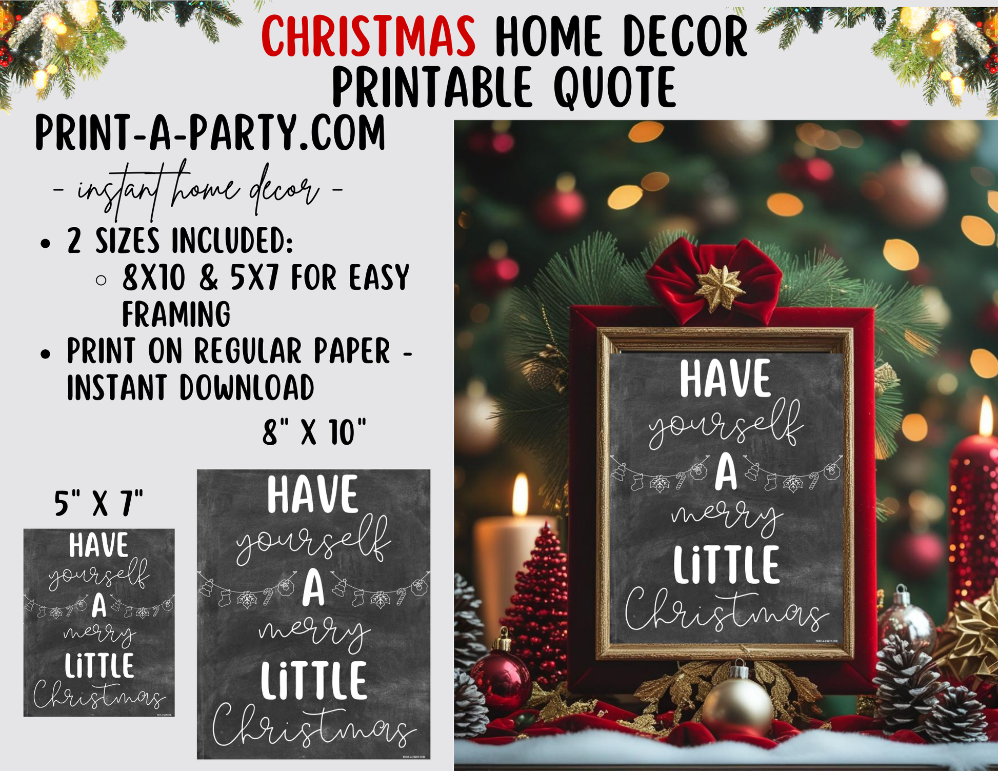 Bring festive charm to your home with our "Have Yourself A Merry Little Christmas" printable holiday Christmas decoration sign! This cheerful holiday quote is the quickest and cutest way to decorate for Christmas—simply download, print, and frame. Perfect for adding seasonal flair to your walls, party tables, or gift displays.