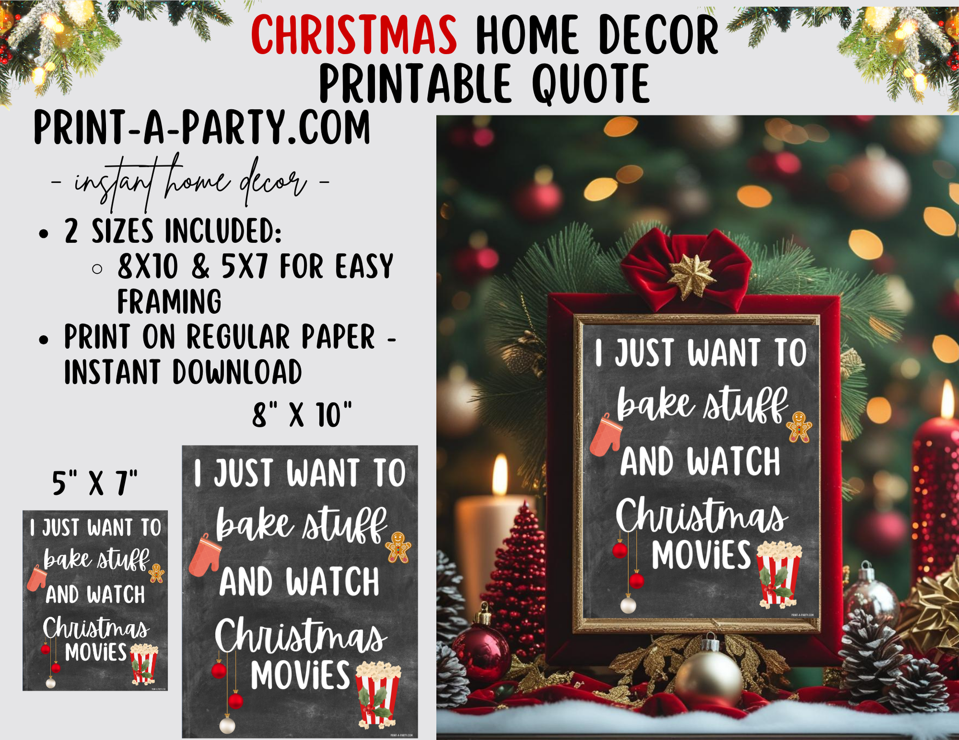 Bring festive charm to your home with our "I Just Want to Bake Stuff and Watch Christmas Movies" printable Christmas holiday sign decoration! This cheerful holiday quote is the quickest and cutest way to decorate for Christmas—simply download, print, and frame. Perfect for adding seasonal flair to your walls, party tables, or gift displays.
