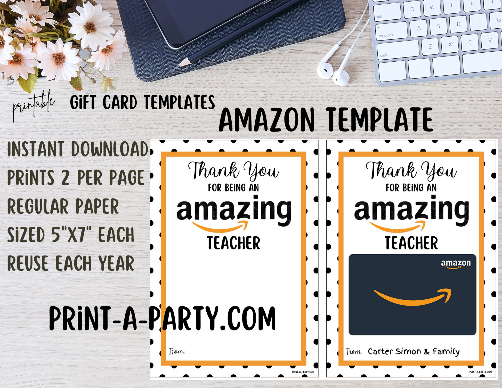 Show your appreciation for teachers and staff with these adorable gift card templates! Customize your message and choose from popular stores like Amazon, Target, Starbucks, and Apple. Each printable template prints two gift cards per page, making it easy to show your gratitude in a fun and convenient way. Perfect for Teacher Appreciation Week, holidays, birthdays, or end-of-the-year gifts.