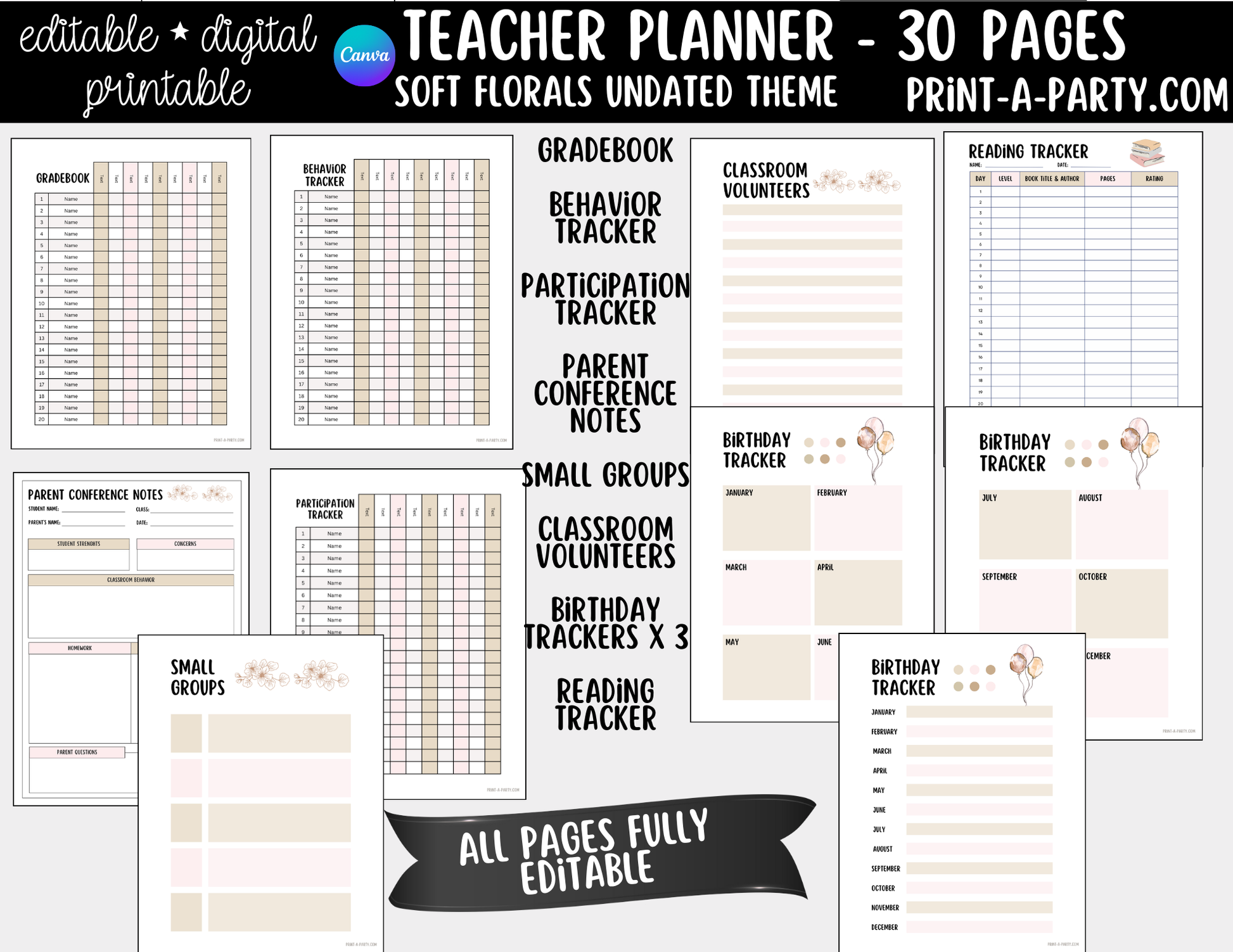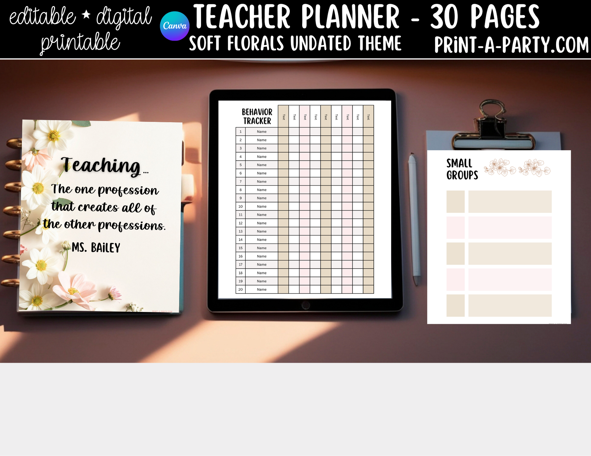 PLANNER: Editable Soft Florals Teacher Planner Undated | 30-Page Canva Template with Covers