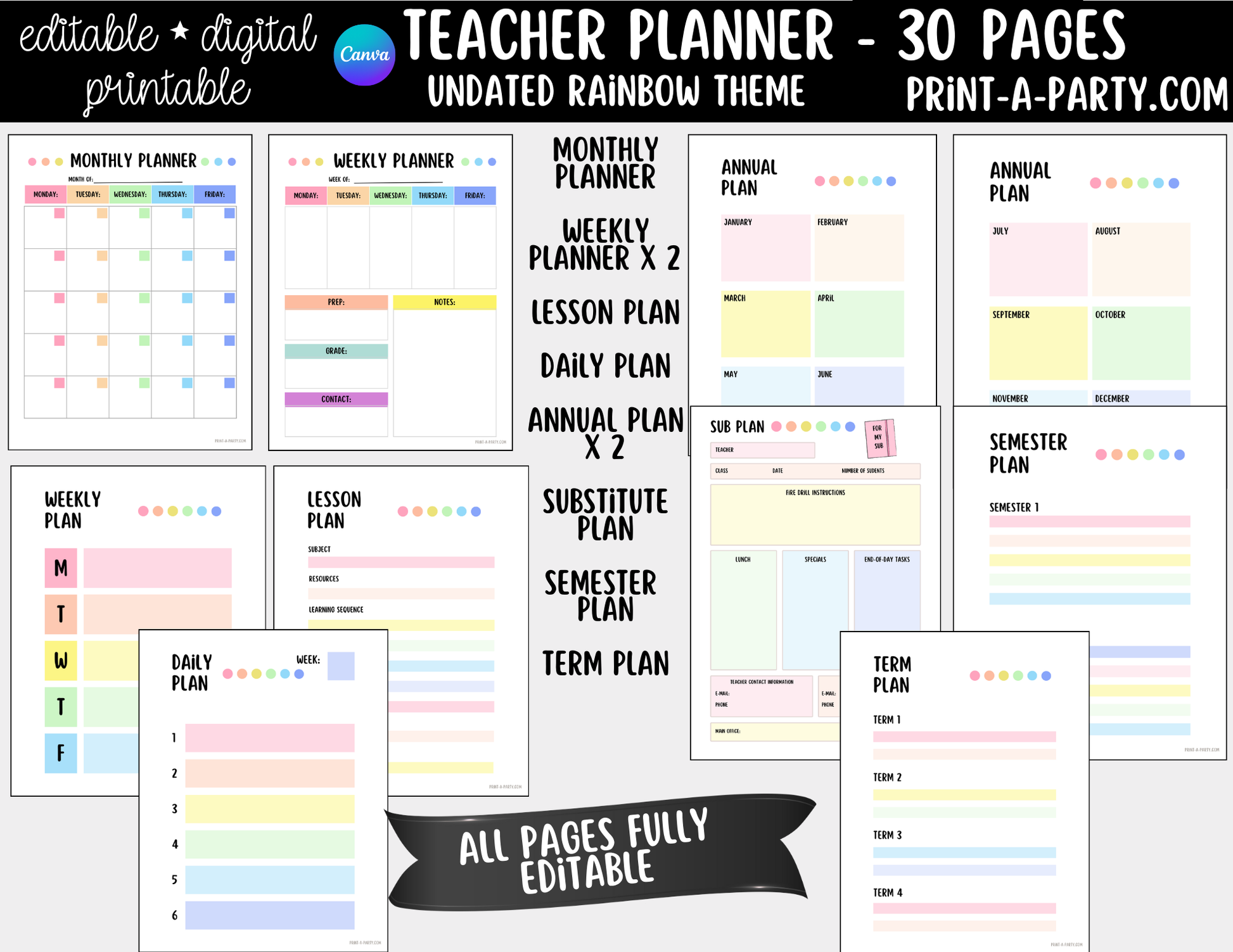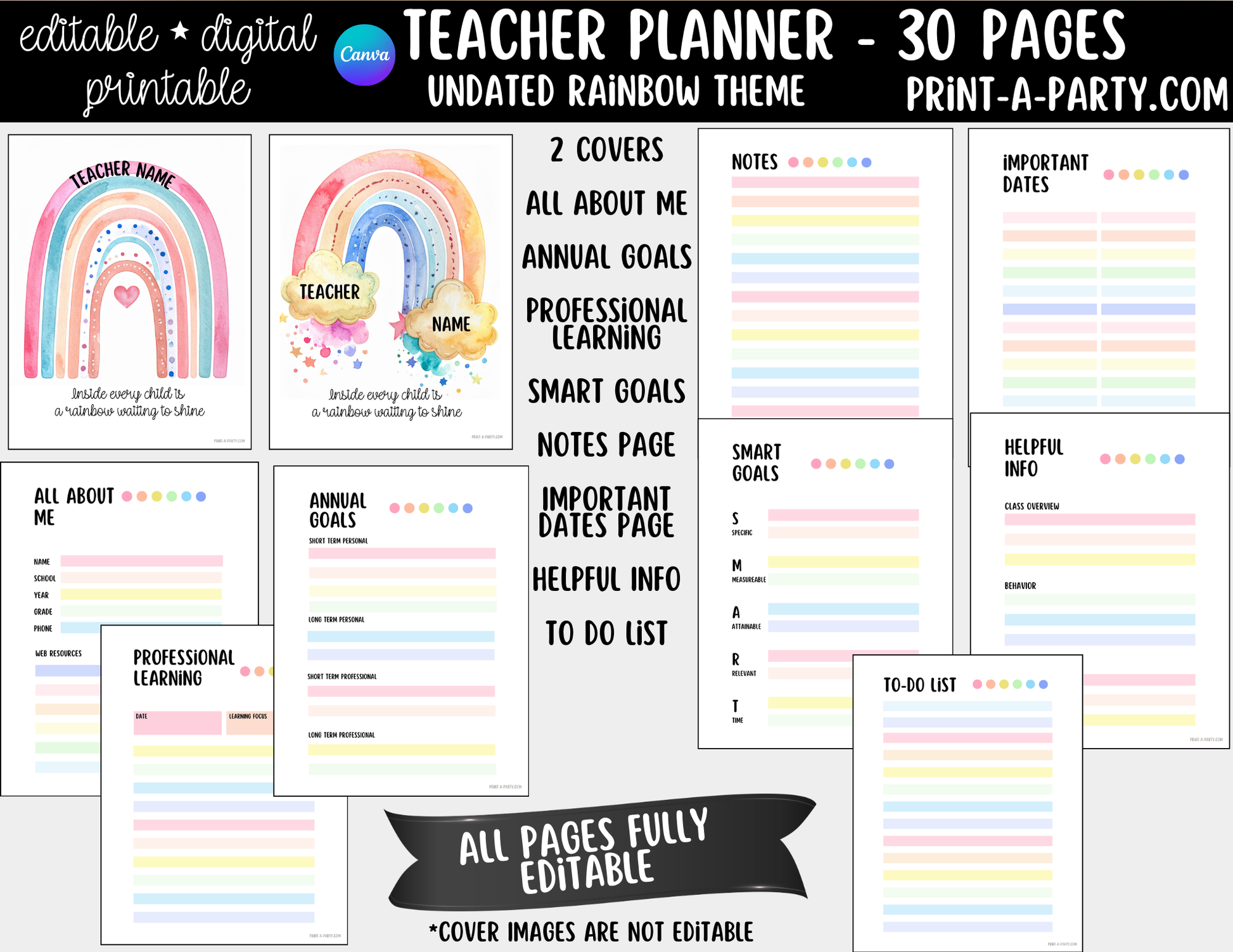 PLANNER: Editable Rainbow Teacher Planner Undated | 30-Page Canva Template with Covers