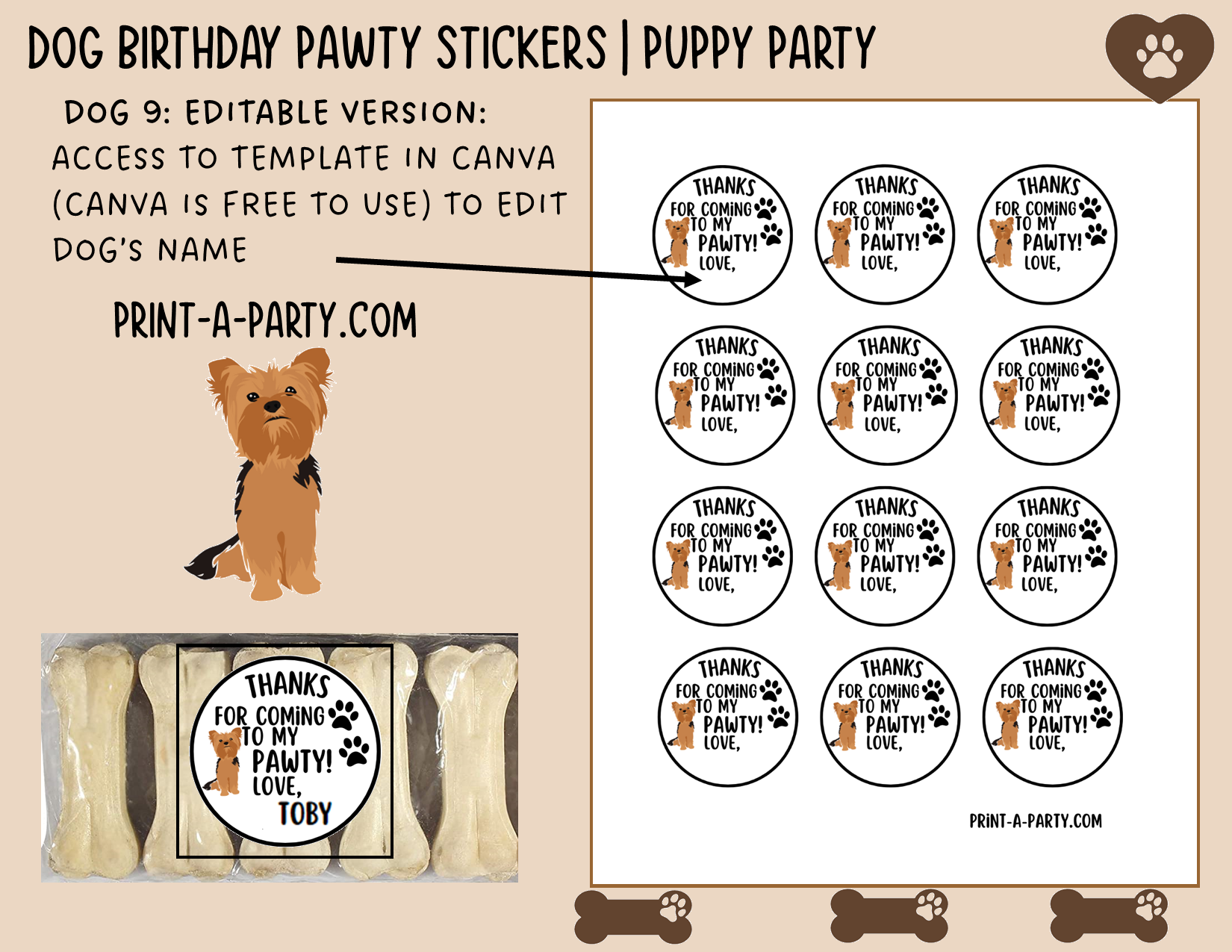 - Editable option: This customized option gives you a PDF with a link to a Canva template (Canva is free software online). This template lets you edit the dog's name on the labels before saving, downloading and printing.