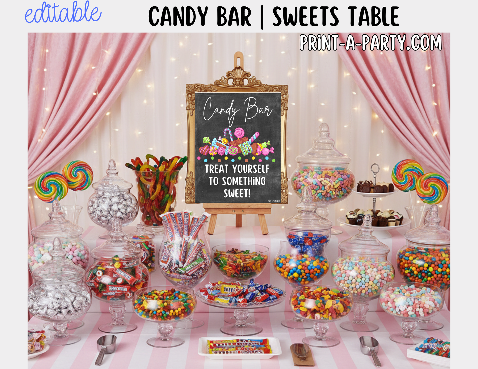 Add a fun and sweet touch to your event with this Editable Candy Bar Sign and Tent Label Set, perfect for creating a “Treat Yourself to Something Sweet” candy buffet guests of all ages will love. This versatile printable kit is ideal for weddings, baby showers, bridal showers, birthday parties, graduations, and any celebration with a dessert or candy table.