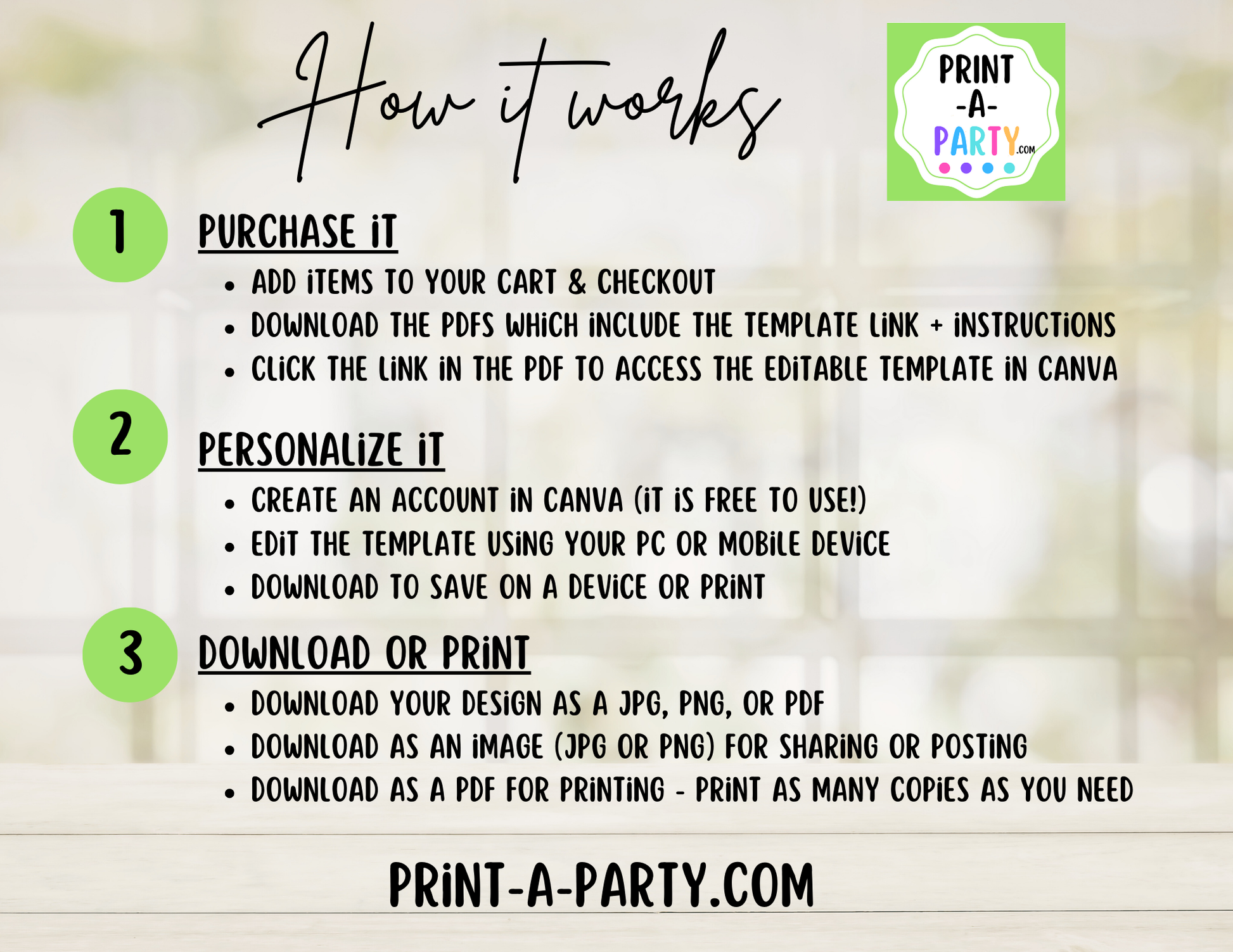 - Multiple download options - JPG/PNG for digital sharing/posting or PDF for printing