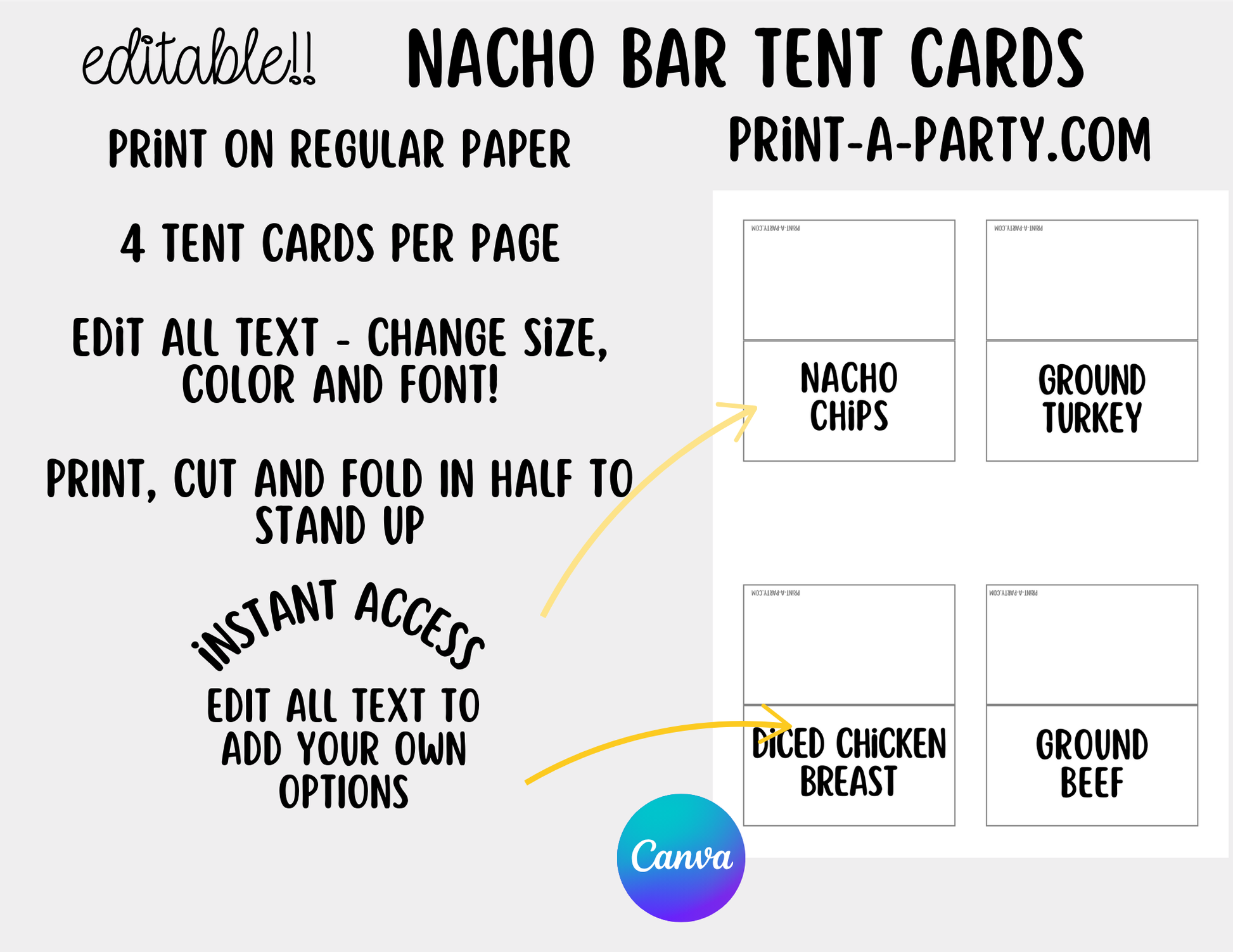 The pre-filled tent cards included are the following: Nacho Chips, Ground Turkey, Diced Chicken Breast, Ground Beef, Green Onion, Lettuce, Black Olives, Pico De Gallo, Jalapenos, Refried Beans, Black Beans, Guacamole, Chili, Salsa, Sour Cream, Rotel, Diced Tomatoes, Green Chilies, Shredded Cheese, Nacho Cheese, Hot Sauce, Queso, Onions, and Peppers. Feel free to edit any of these options or add even more!