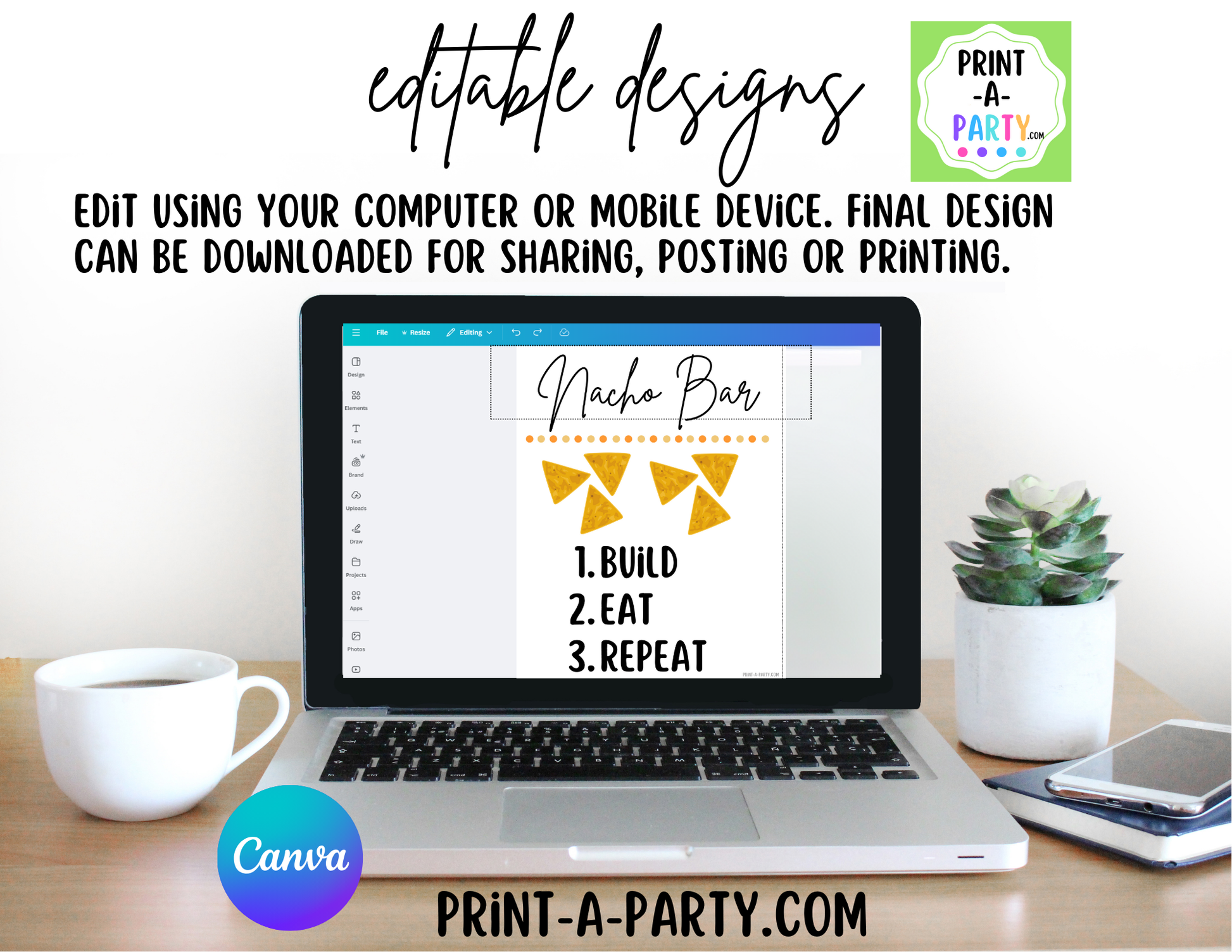 This editable and printable nacho bar is perfect for any occasion and can be easily created in just minutes using Canva (it's free to use). Easily add your details and modify the wording, font, and colors. Once finished, it is easy to download as an image for sharing or posting, or a PDF for printing.