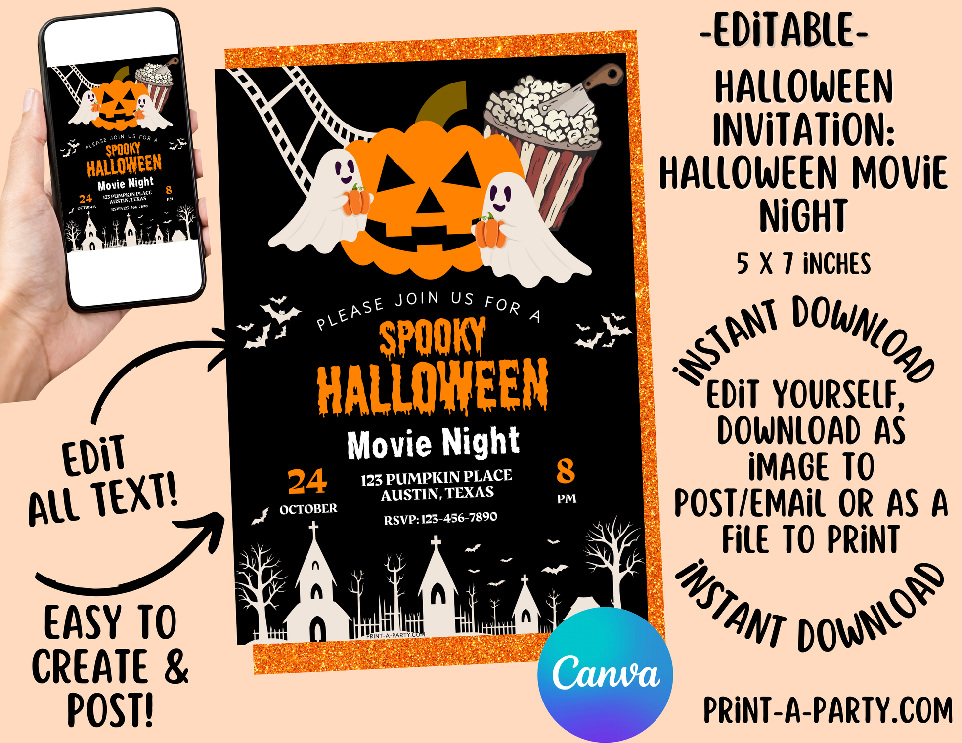 HALLOWEEN Editable Halloween Horror Movie Night Invitation – Customizable Template for Spooky Party Fun or Horror Movie Night