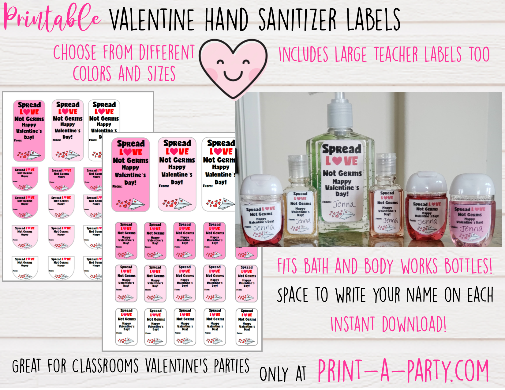 Spread love and prevent the spread of germs on Valentine's Day with these printable hand sanitizer labels! Perfect for classrooms during flu season, these labels can be printed on any color printer and feature over 40 labels for bottles and 3 large labels for teacher bottles. Each label boldly declares "Spread love not germs! Happy Valentine's Day" and includes space to write the child's name. Get yours now and make this Valentine's Day a healthy and loving one!
