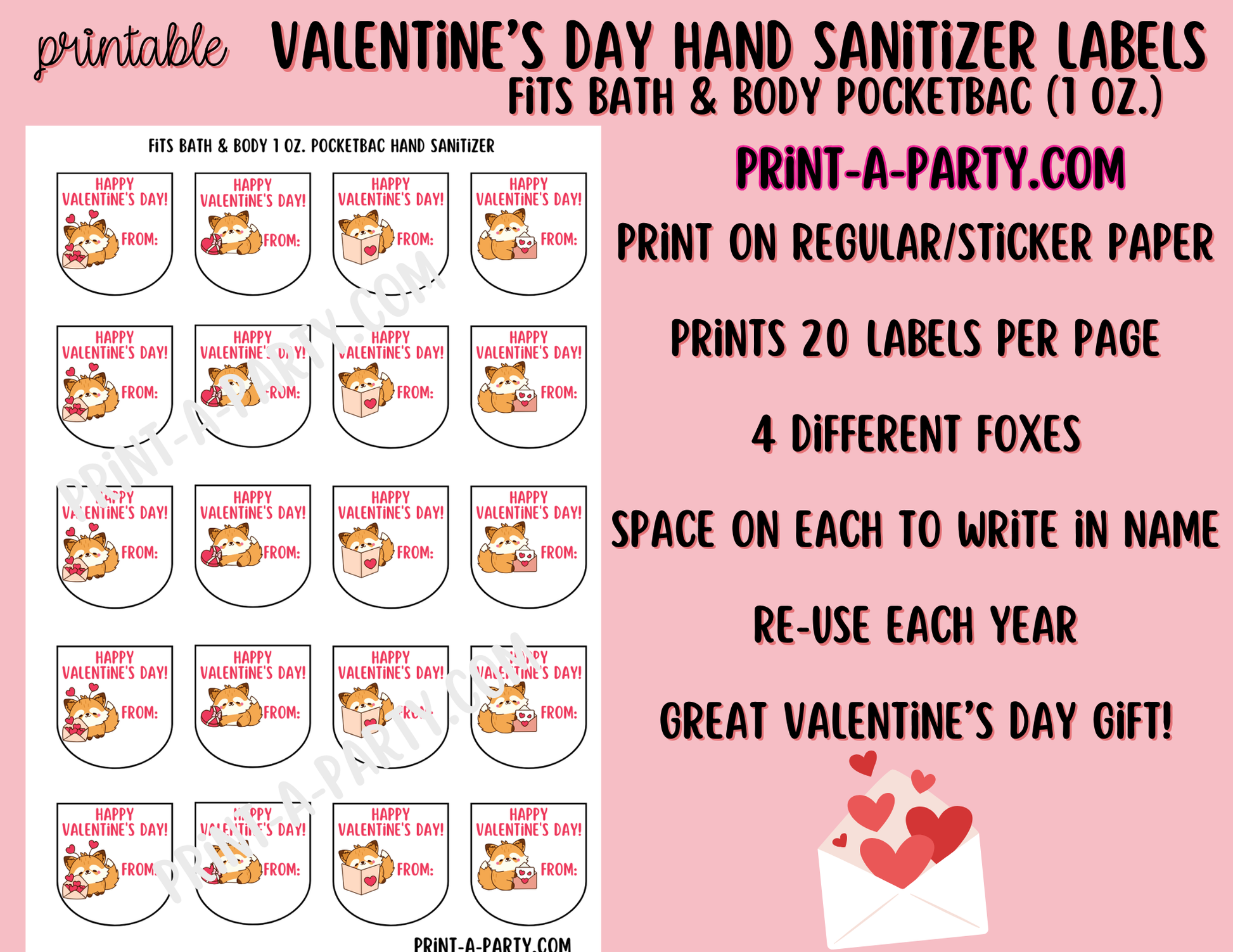 DIY Valentine’s Day Hand Sanitizer Labels - Fox theme – Printable Classroom Valentines for PocketBac 1 oz Bottles
