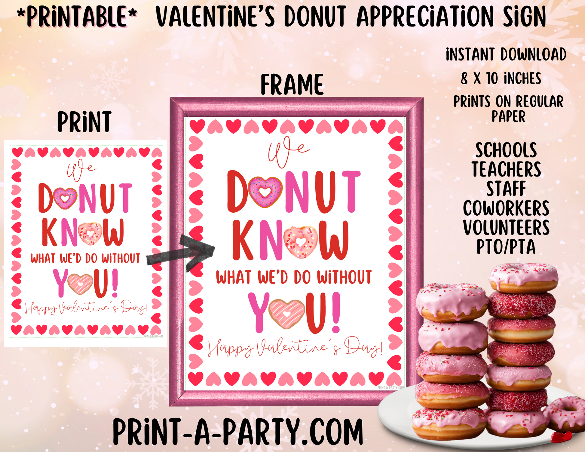 Celebrate Valentine’s Day with a sweet and thoughtful touch using this Printable Valentine’s Donut Appreciation Sign! Designed to make anyone feel valued, this festive 8x10 sign adds charm to any donut bar, buffet table, staff lounge, or appreciation event. Featuring the heartfelt message: “We Donut Know What We’d Do Without You! Happy Valentine’s Day!”, it’s an easy and meaningful way to say thank you.