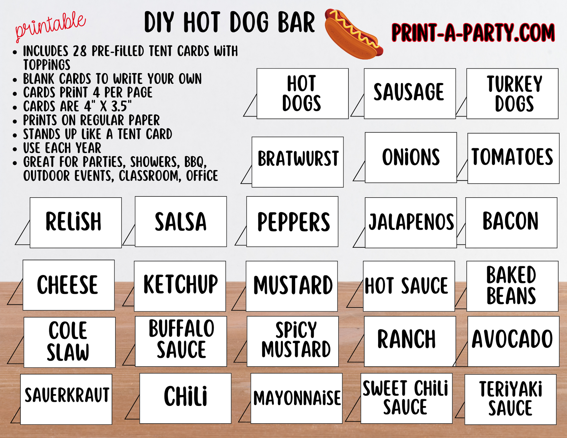 With pre-labeled tent cards, blank labels, and themed recipe cards, setup is quick, organized, and stress-free—no guesswork needed. The pre-filled labels included are the following: Onions, Tomatoes, Bacon, Pickles, Salsa, Peppers, Jalapenos, Relish, Cheese, Chili, Guacamole, Cole Slaw, Baked Beans, Hot Dogs, Bratwurst, Turkey Dogs, Sausage, Ketchup, Mustard, BBQ Sauce, Hot Sauce, Spicy Mustard, Ranch, Buffalo Sauce, Sauerkraut. Print as many or as few as you need for your setup. A blank page of tent cards is also provided.