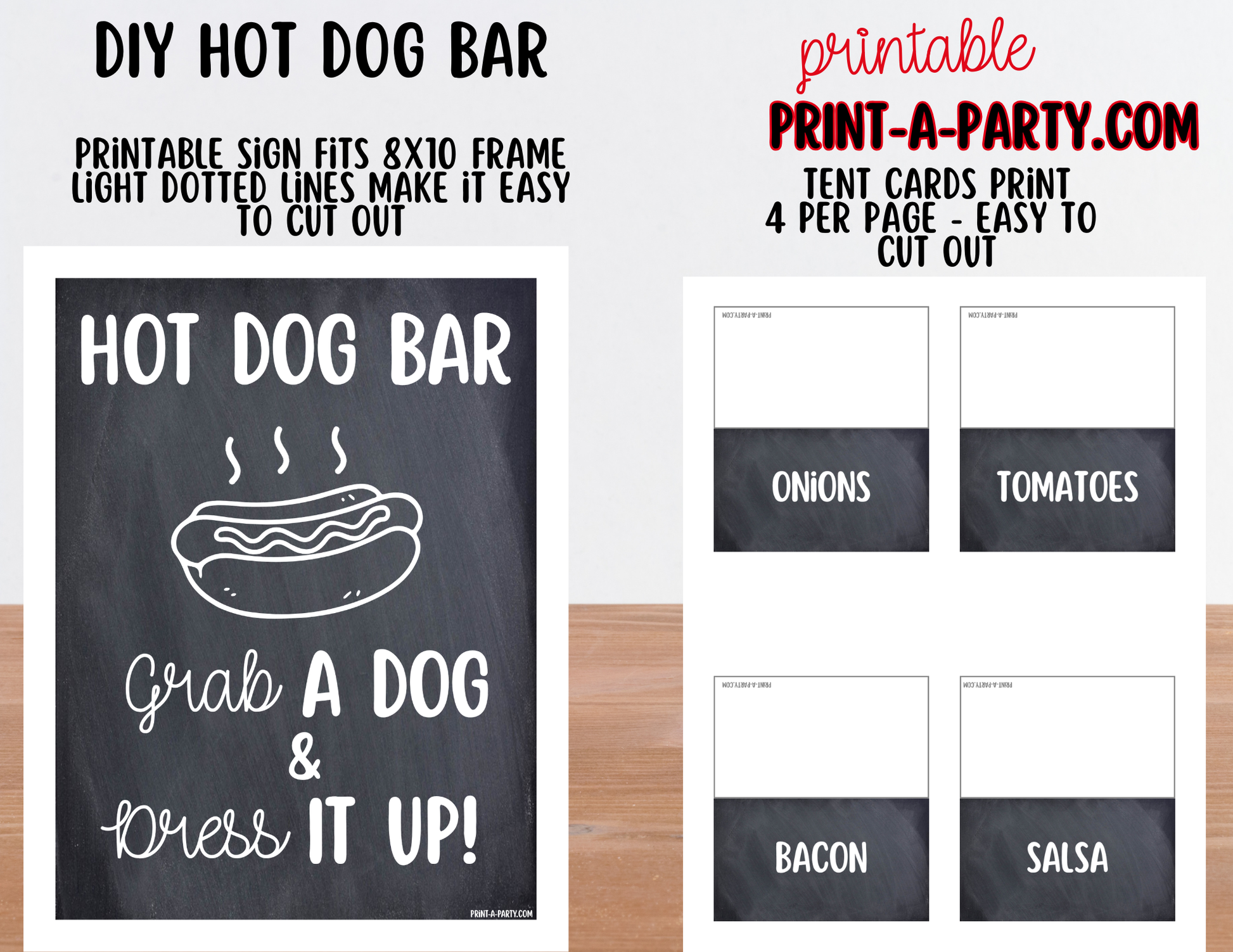 Hot Dog Bar Set – Printable Food Station Sign & Topping Tent Cards for Cookouts, Holidays, and Events