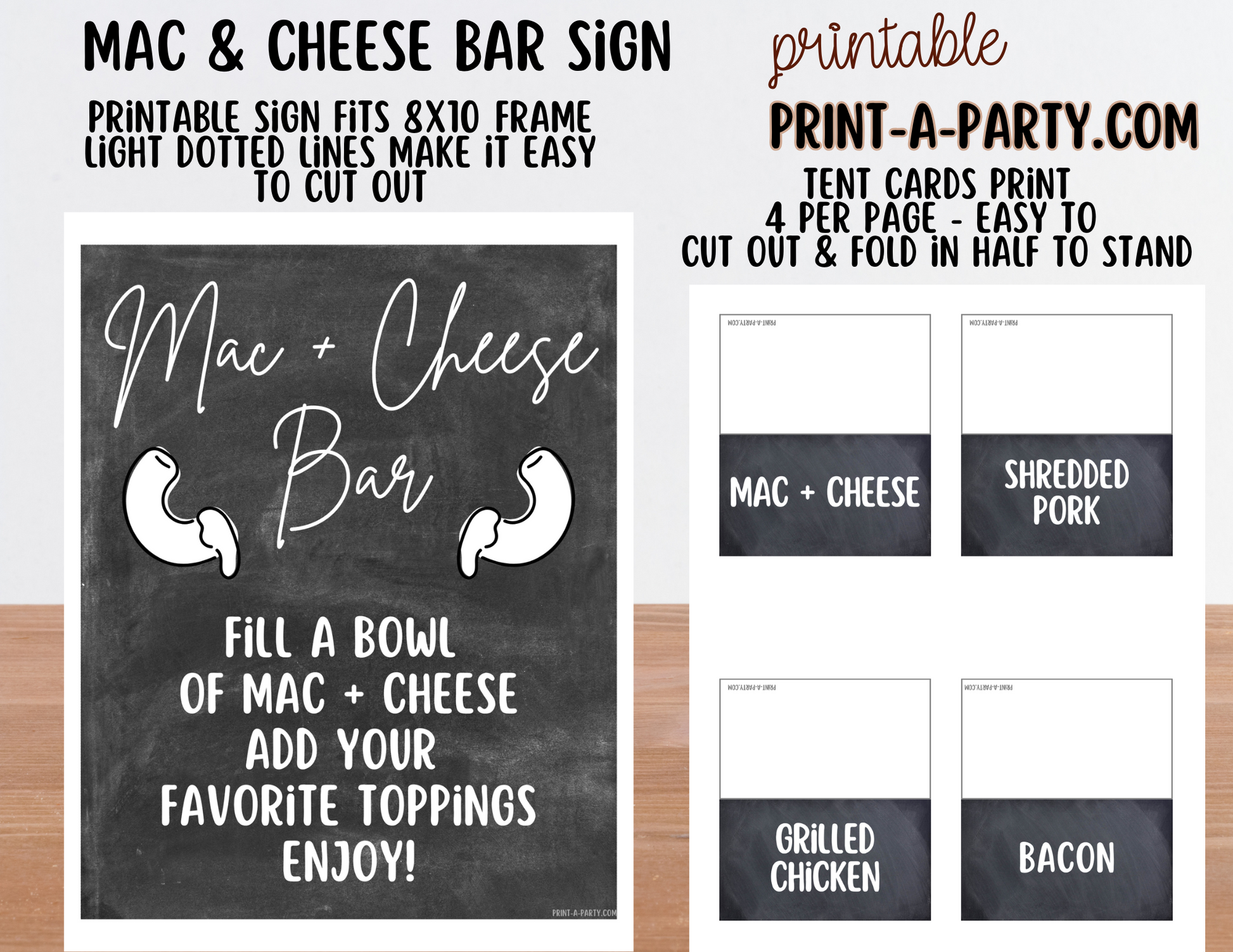 MAC AND CHEESE BAR Printable Sign & Food Topping Tent Cards in Chalkboard – DIY Food Bar Station - perfect for parties, showers, slumber parties, buffets, the office and more!