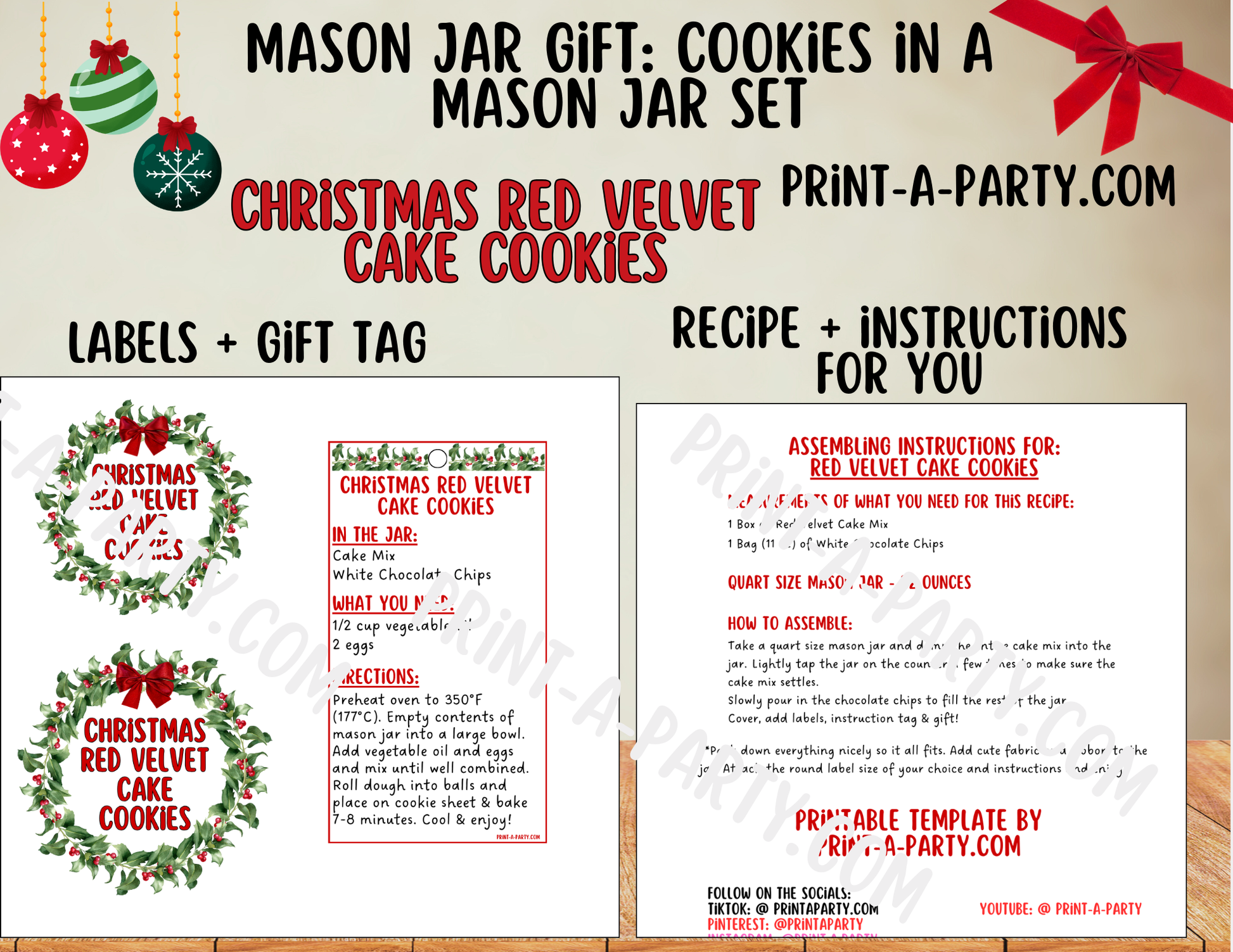 MASON JAR GIFT: Christmas Red Velvet Cake Cookies in a Mason Jar Printable Kit - DIY Gift Idea for the Holidays