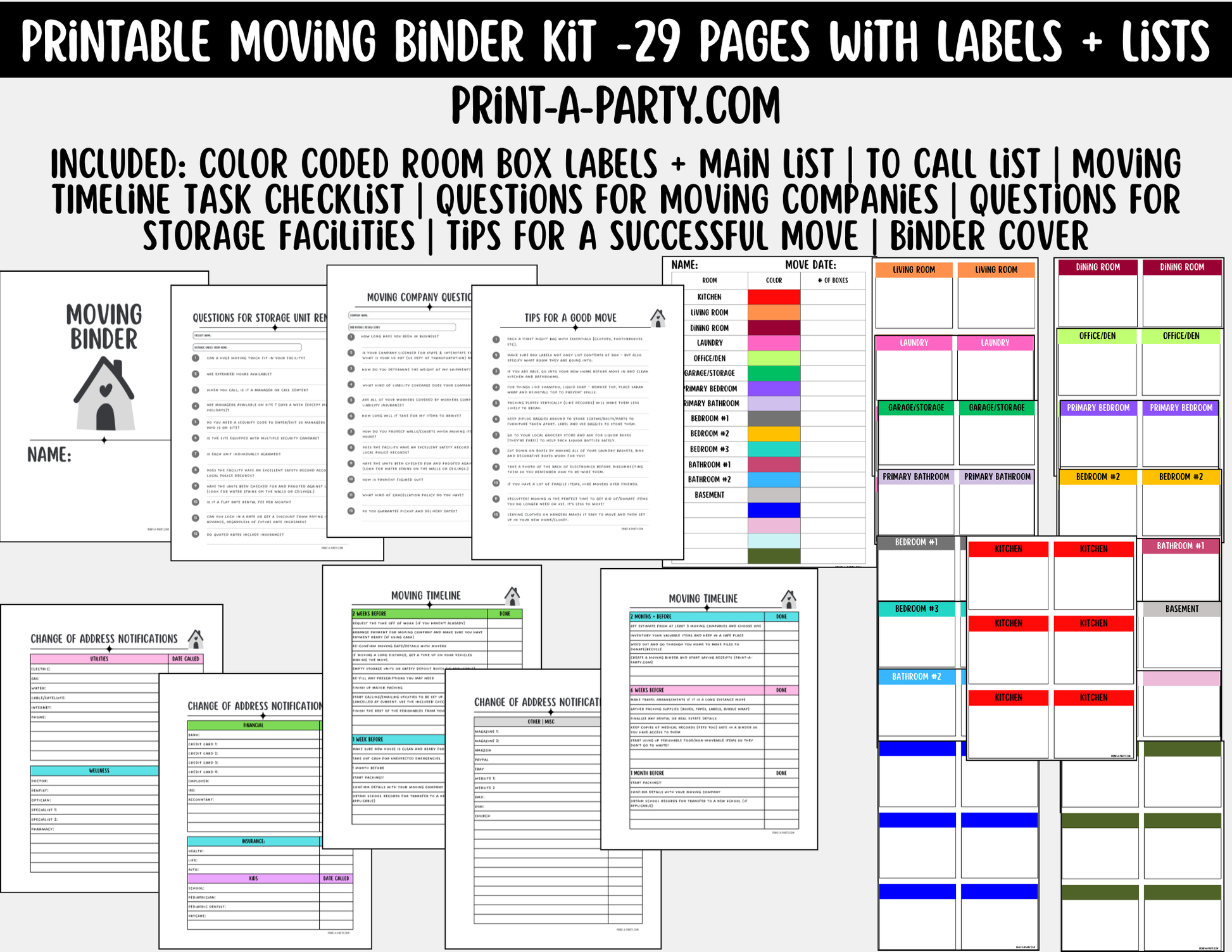 Moving Planning Binder – 29 Pages Color-Coded Labels, Lists & Checklists (Instant Download)