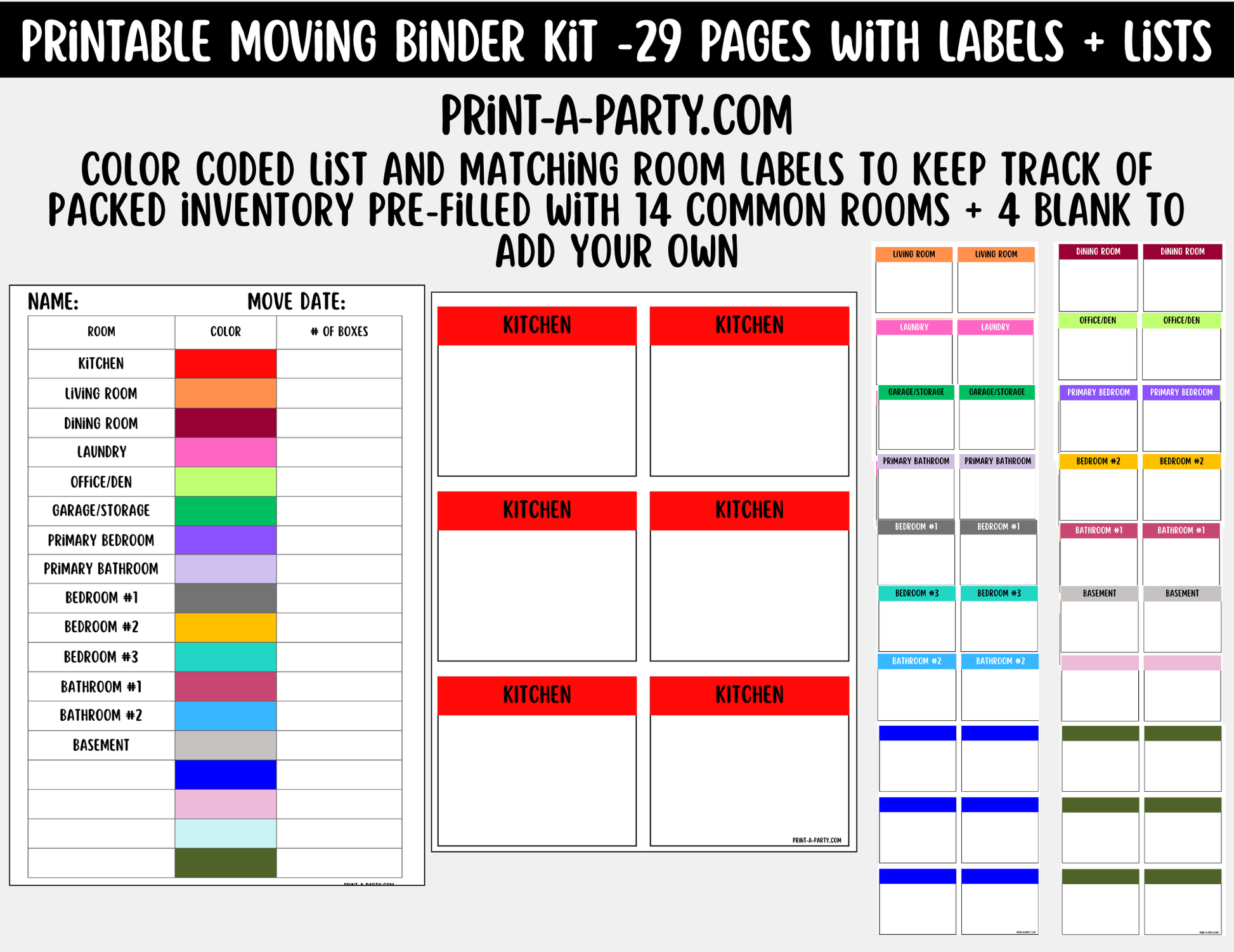 - 18 pages color-coded box labels (14 rooms + 4 blanks, 6 labels/page, 3.5"x3")