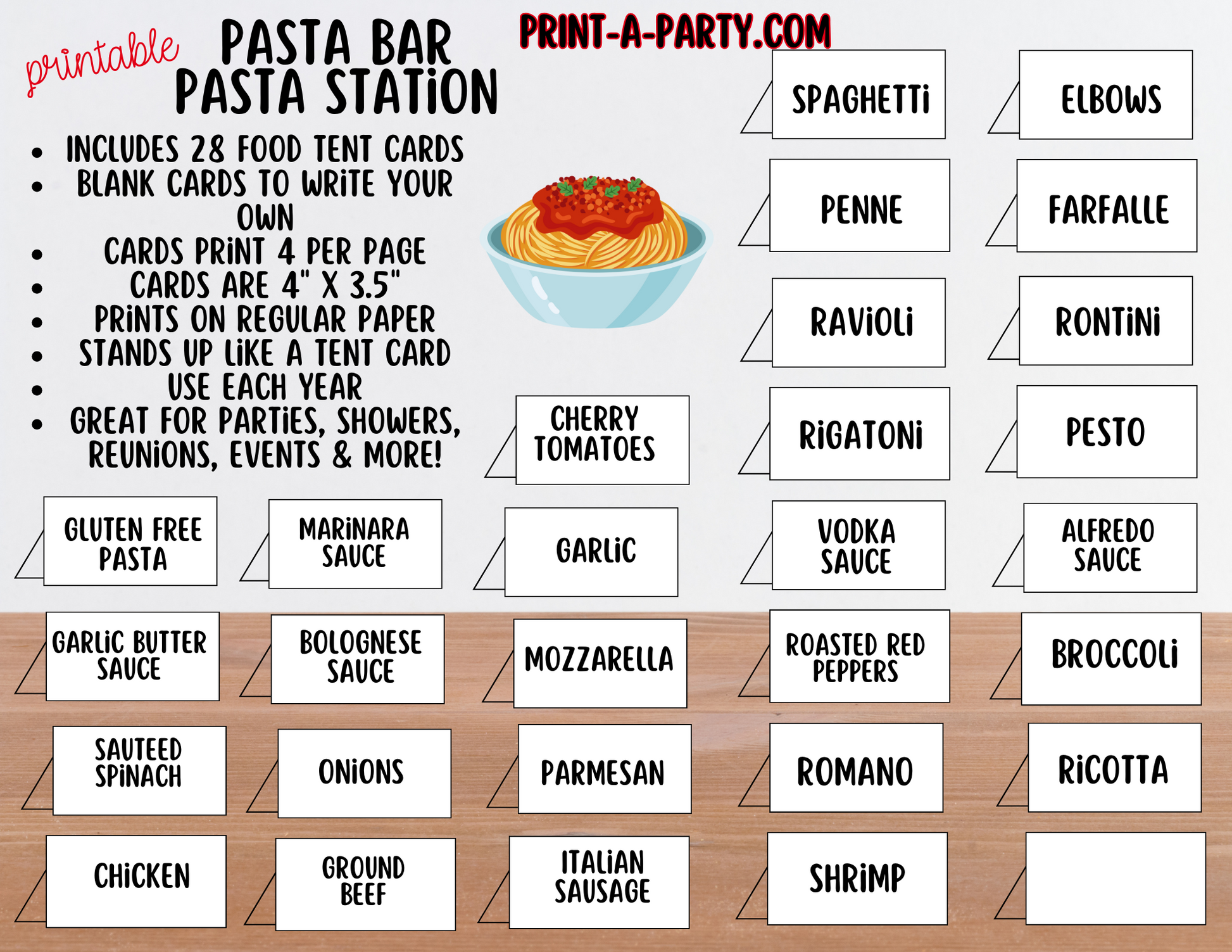 The pre-filled tent cards included are the following: Spaghetti, Elbows, Penne, Farfalle, Ravioli, Rotini, Rigatoni, Pesto, Gluten Free Pasta, Marinara Sauce, Vodka Sauce, Alfredo Sauce, Garlic Butter Sauce, Bolognese Sauce, Cherry Tomatoes, Roasted Red Peppers, Broccoli, Sauteed Spinach, Onions, Garlic, Mozzarella, Parmesan, Romano, Ricotta, Chicken, Ground Beef, Italian Sausage, and Shrimp. Print as many or as few as you need for your setup. A blank page of tent cards is also provided so you can add your own. Use a chalkboard marker for this finish.