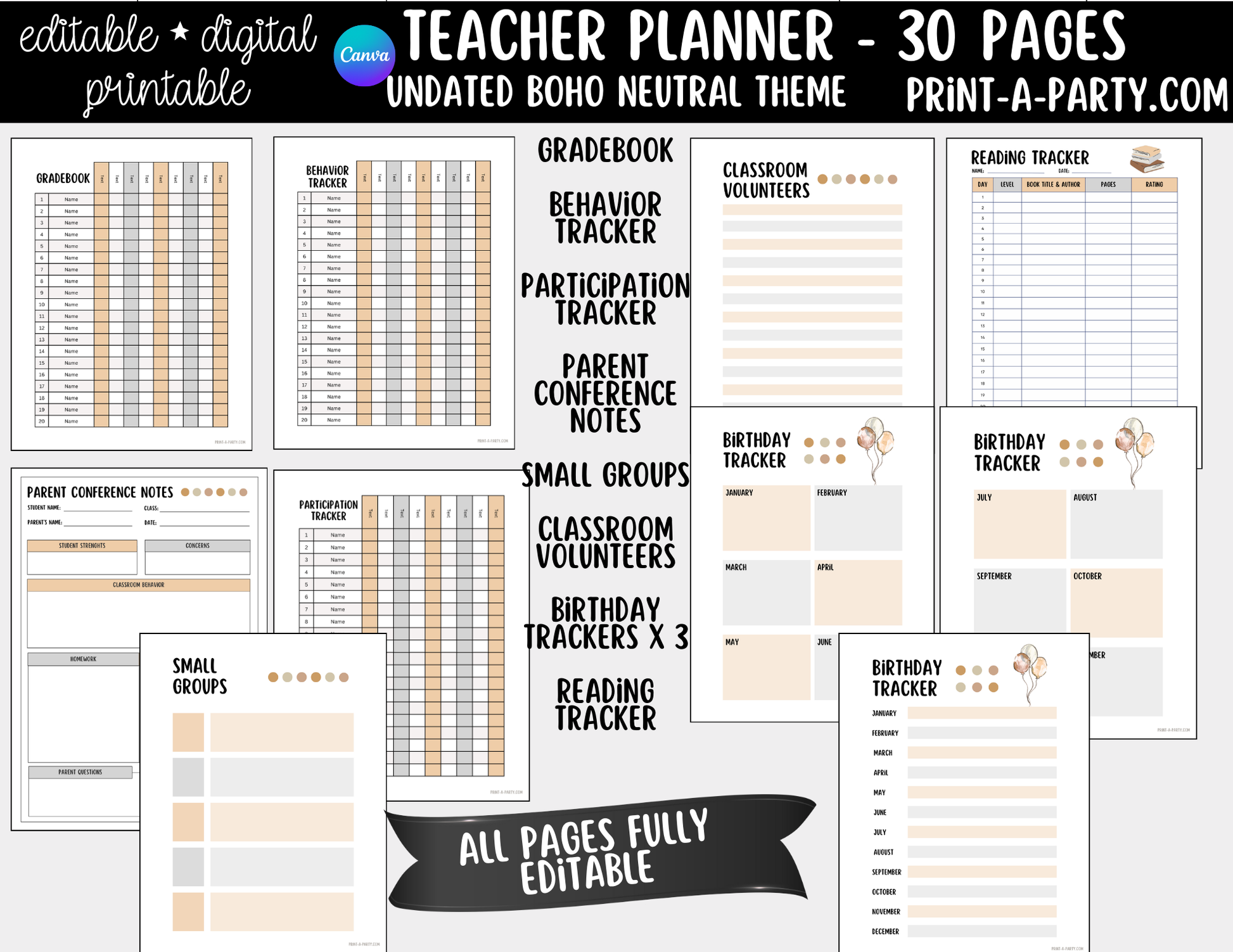 PLANNER: Editable Boho Neutral Teacher Planner | 30-Page Undated Canva Template w/ Covers