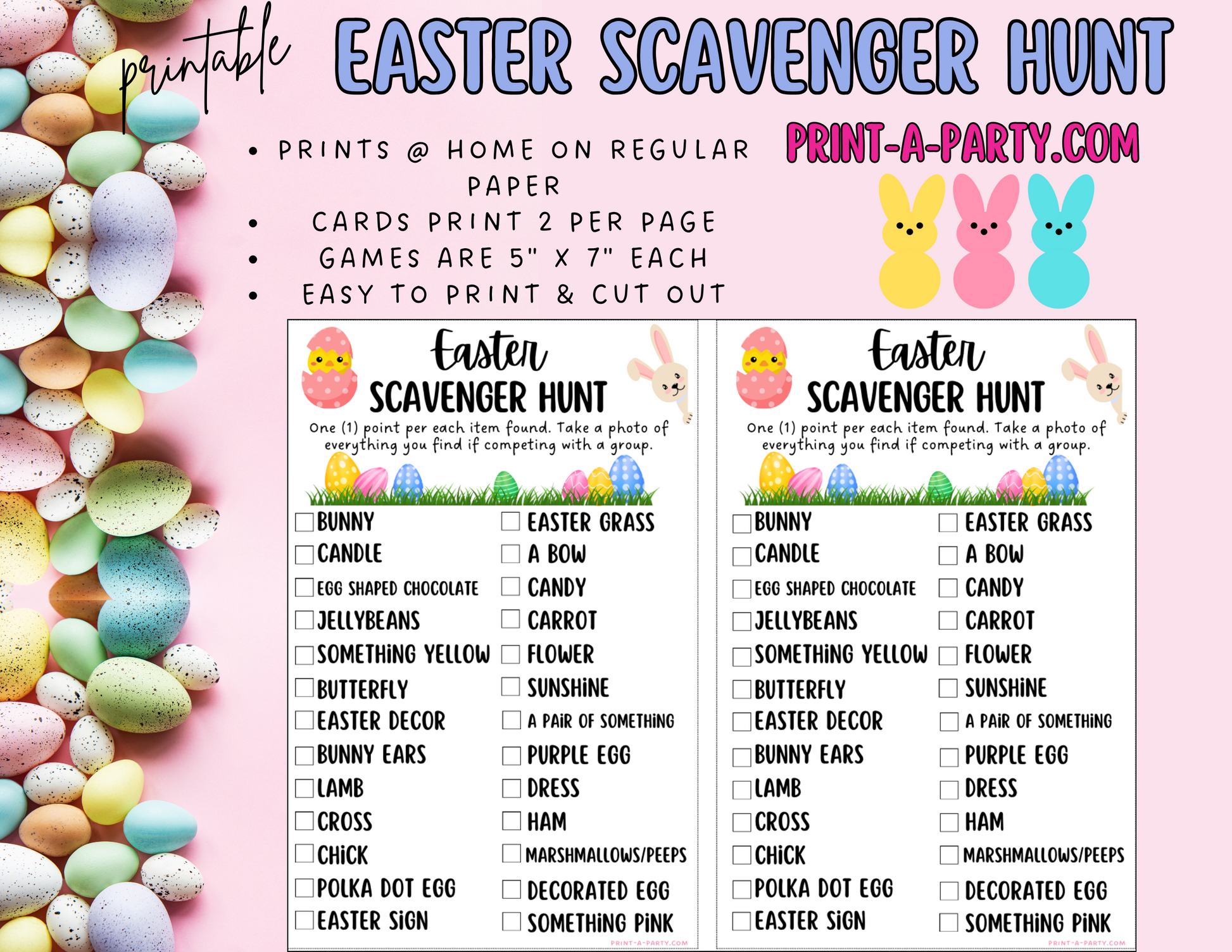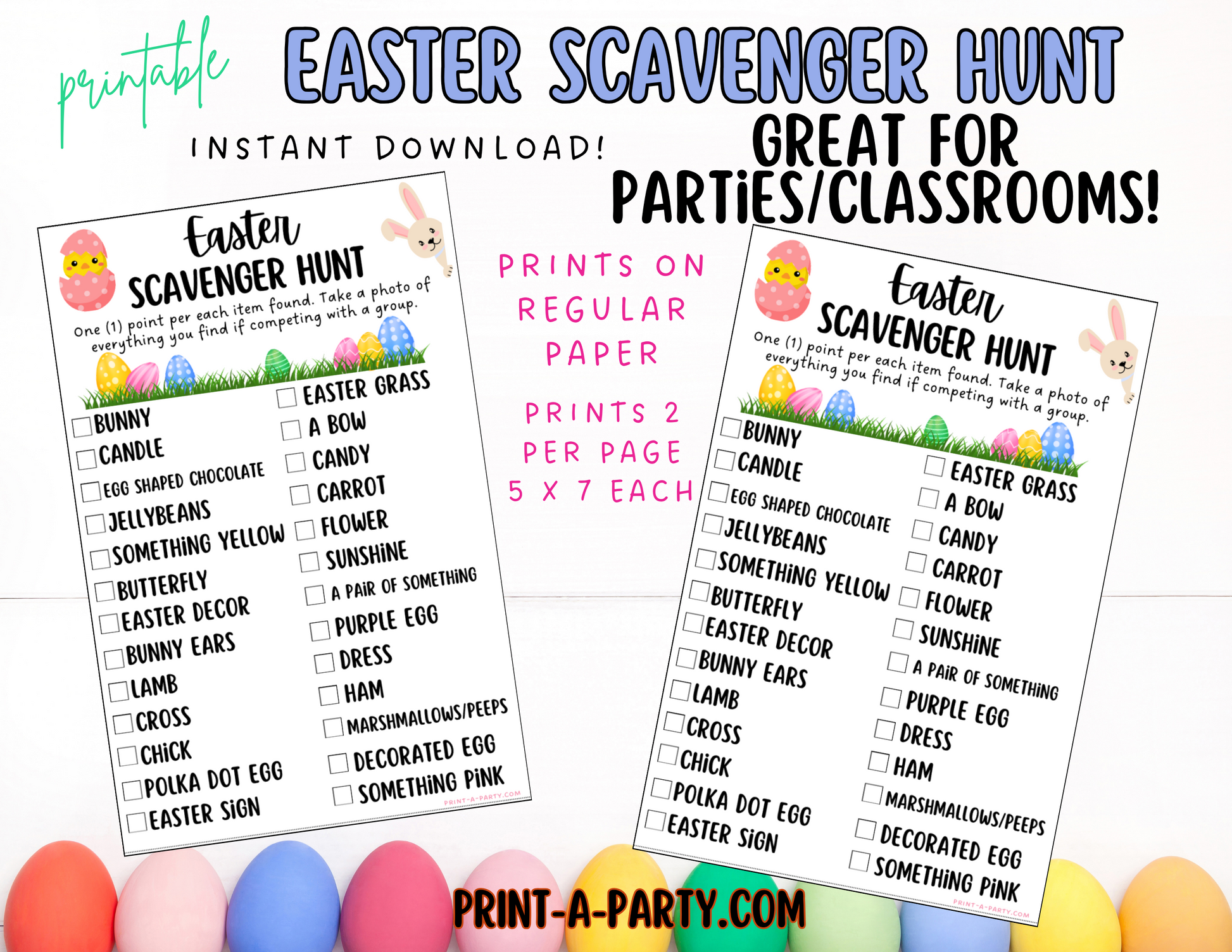 Our Scavenger Hunt game measures 5" X 7" and prints 2 per page. Light dotted lines help indicate where to trim. This Easter-themed Scavenger Hunt Game is an instant download and a fun activity for kids, parties, classrooms, and more. Players will have fun finding a variety of Easter-themed items - a great way to celebrate the season! Print at home for easy setup.