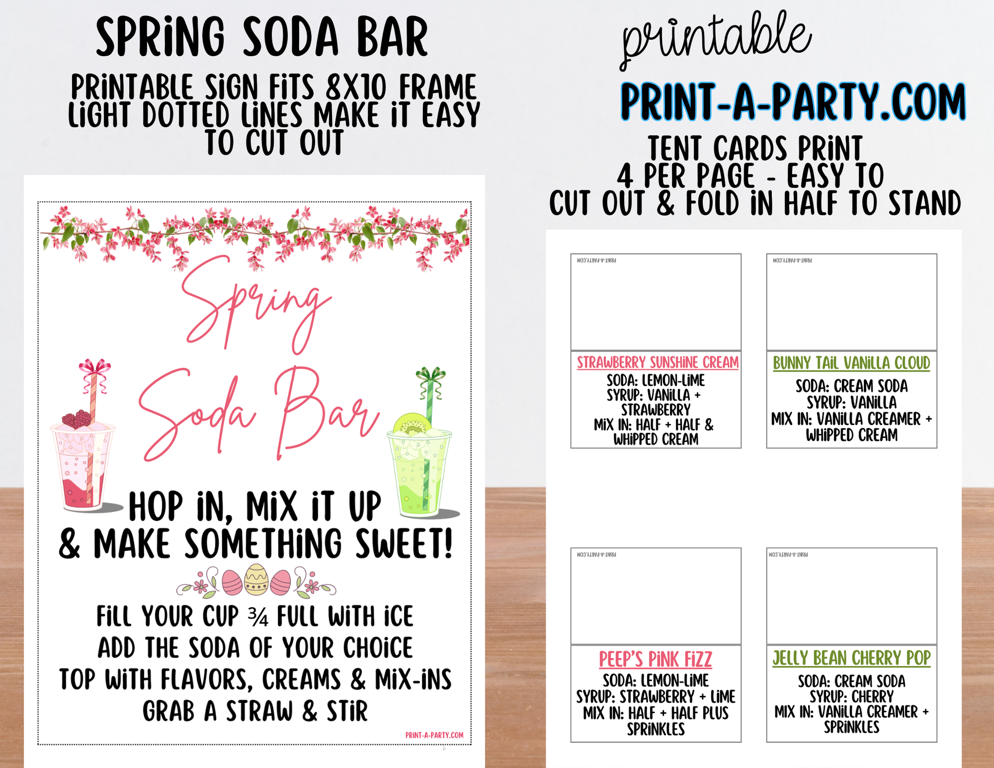 The pre-filled tent cards included have the following recipes: Strawberry Sunshine Cream, Bunny Tail Vanilla Cloud, Peep's Pink Fizz, Jelly Bean Cherry Pop, Egg Hunt Cherry Limeade, Spring Chick Float, Basket of Blooms Splash, Garden Party Lime Fizz, Sunshine Splash, Cherry Blossom Pop, Pastel Parade Cream, and Tulip Time Twinkle Soda. Print as many or as few as you need for your setup. A blank page of tent cards is also provided so you can add your own.