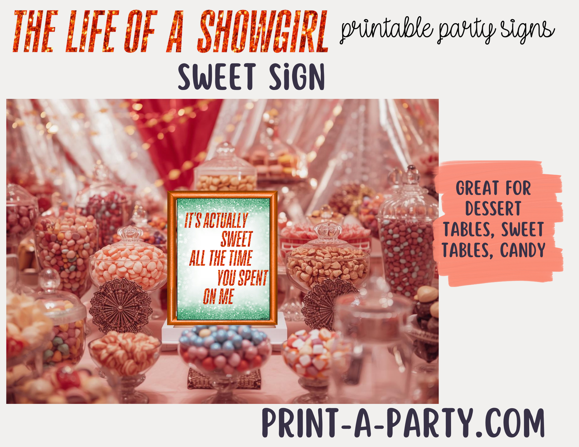 Each sign features lyric-inspired designs that pair perfectly with your party favors, dessert table, food and drink stations, or DIY Swiftie accessories. Mix and match to create your own dazzling Taylor-themed setup that’s as bold and beautiful as the Showgirl era itself.