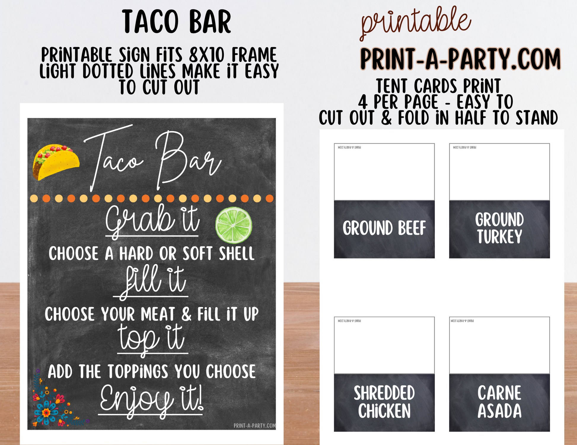 Editable version here: Editable Taco Bar in Chalkboard - Sign and tent cards fully editable and printable – PrintAParty