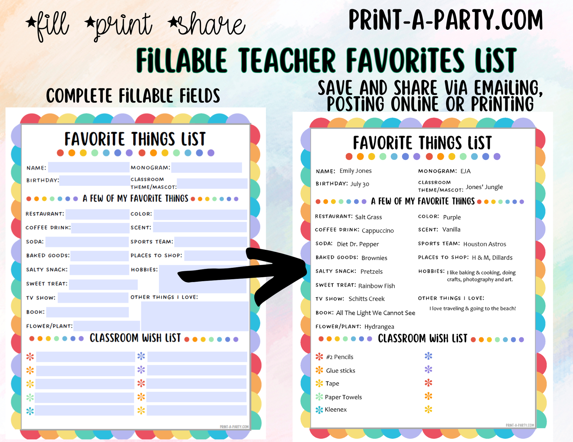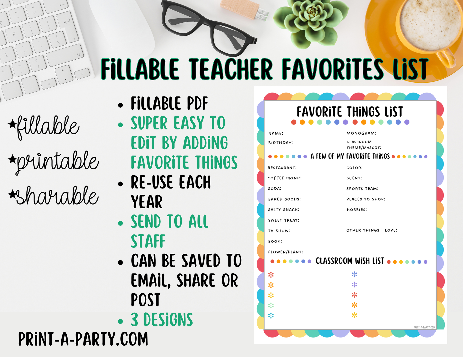 Teacher Favorite Things List - Edit via a Fillable PDF - Printable, Shareable - Teacher Wishlist, Room Moms, PTO School Staff Appreciation