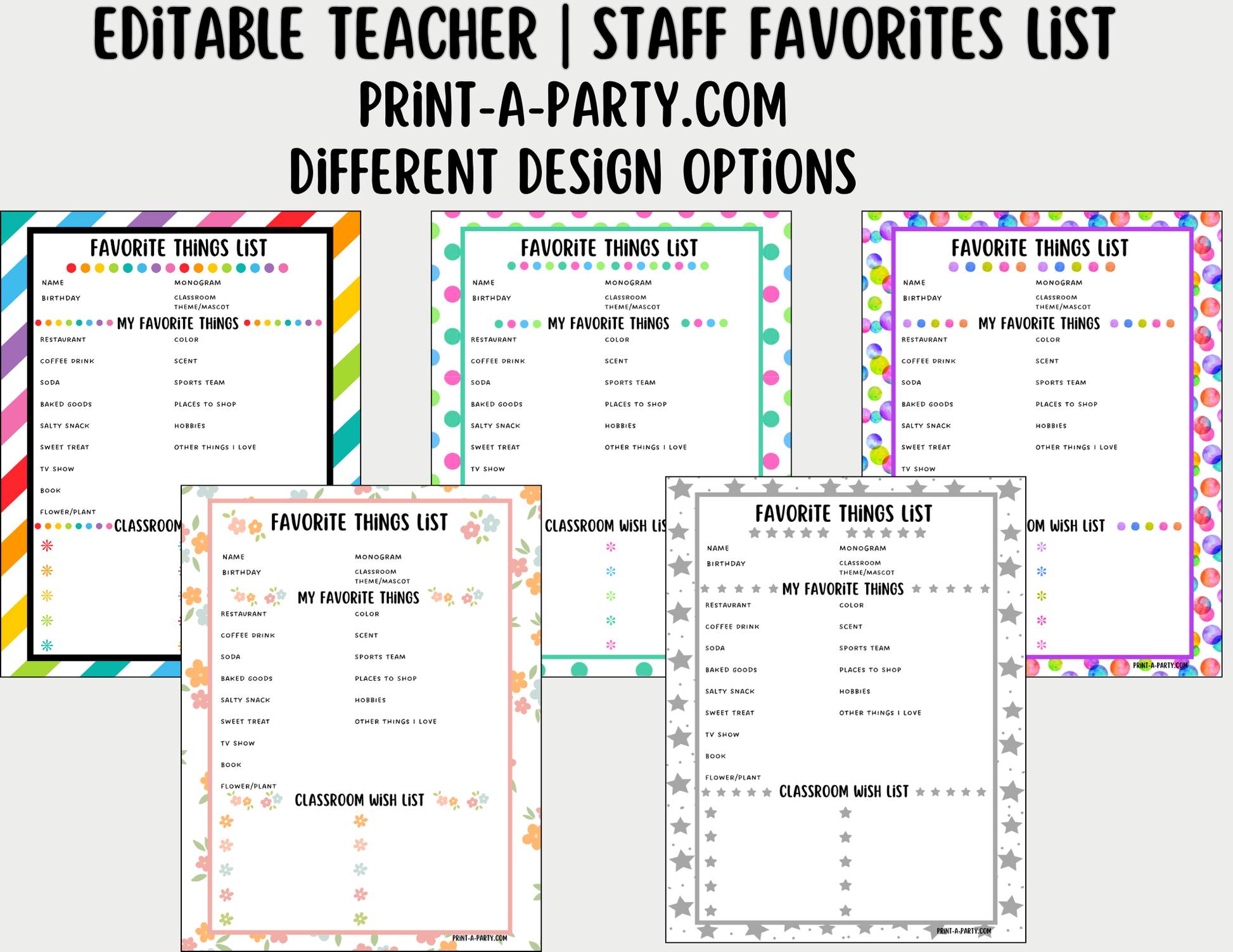 This template includes pre-filled categories (fully editable) and easy-to-use text boxes so teachers and staff can quickly type their favorites—snacks, drinks, stores, hobbies, and more. When finished, save as a PDF or image to email, print, post online, or keep for planning.