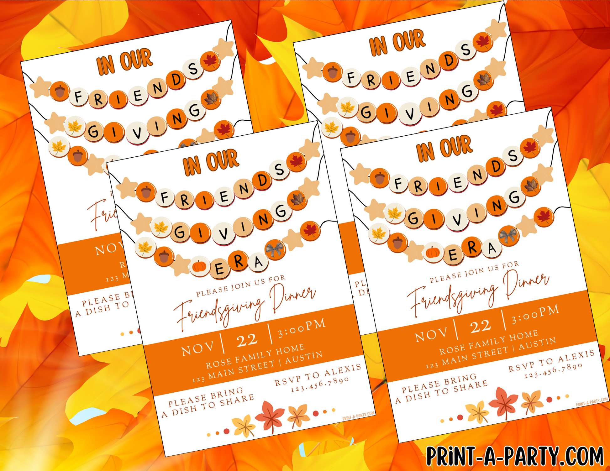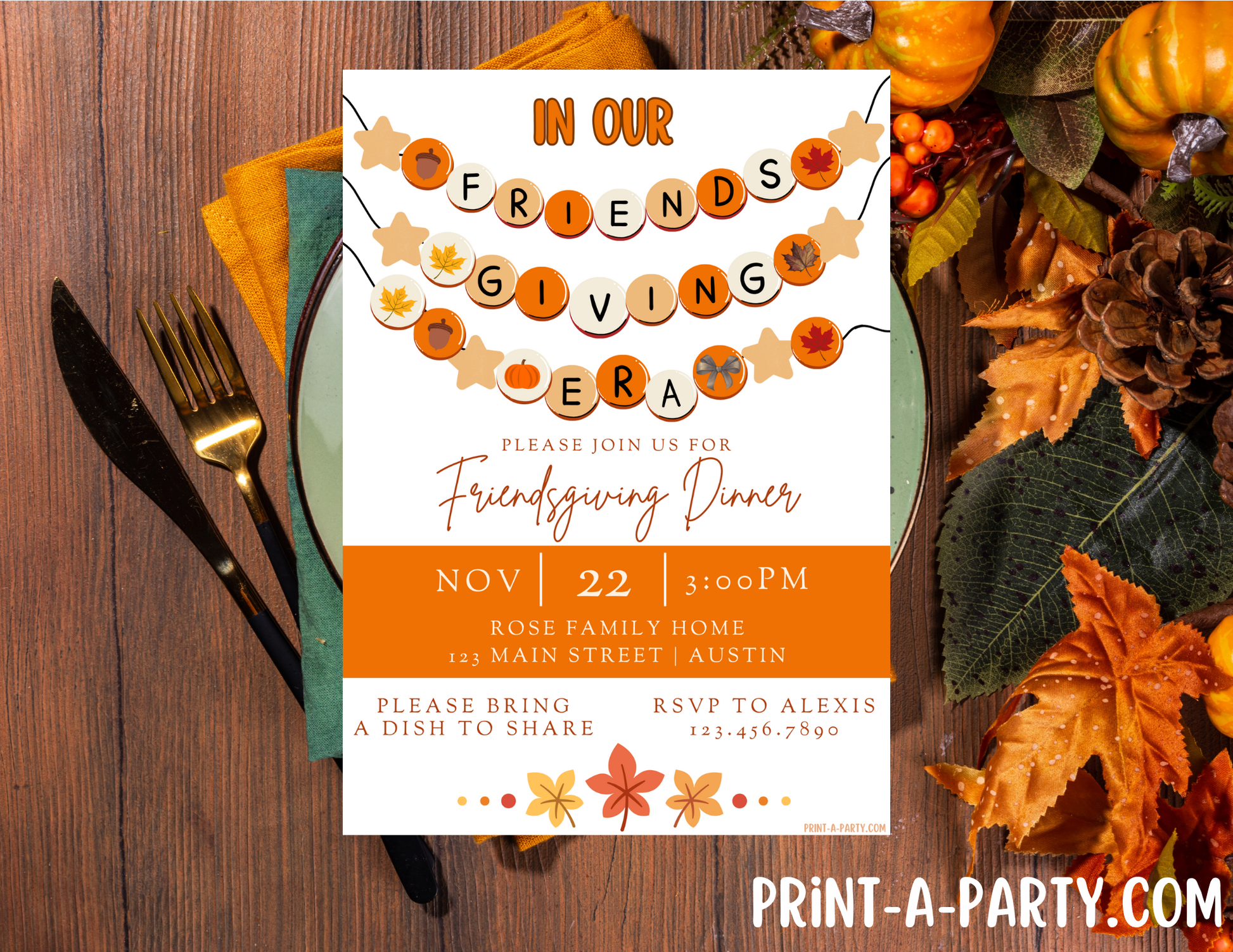 Gather your besties for an unforgettable Friendsgiving celebration with this trendy and customizable invitation. Inspired by friendship bracelets and the popular “era” vibe, this editable Canva template is the perfect way to set the mood for a cozy, gratitude-filled meal with friends.