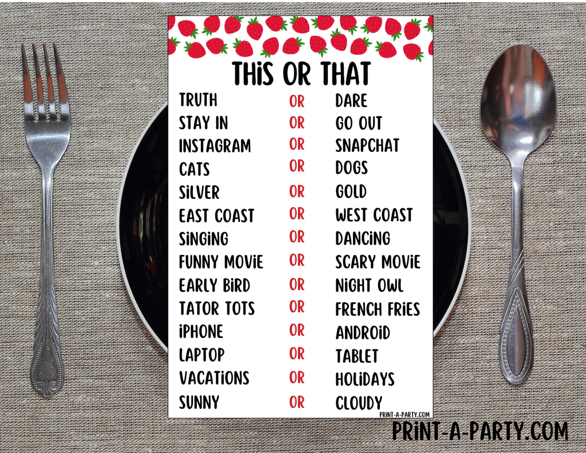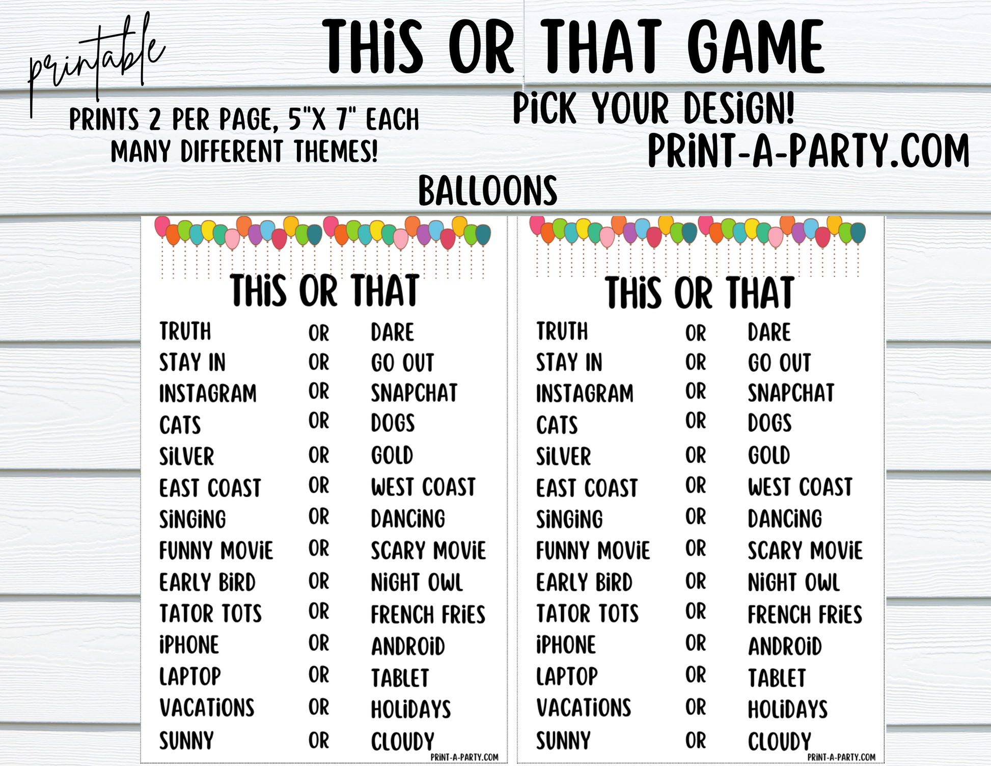 THIS OR THAT GAME | Game Printable | 2 games per page | Birthday Game | Party Game | School Game | Instant Download