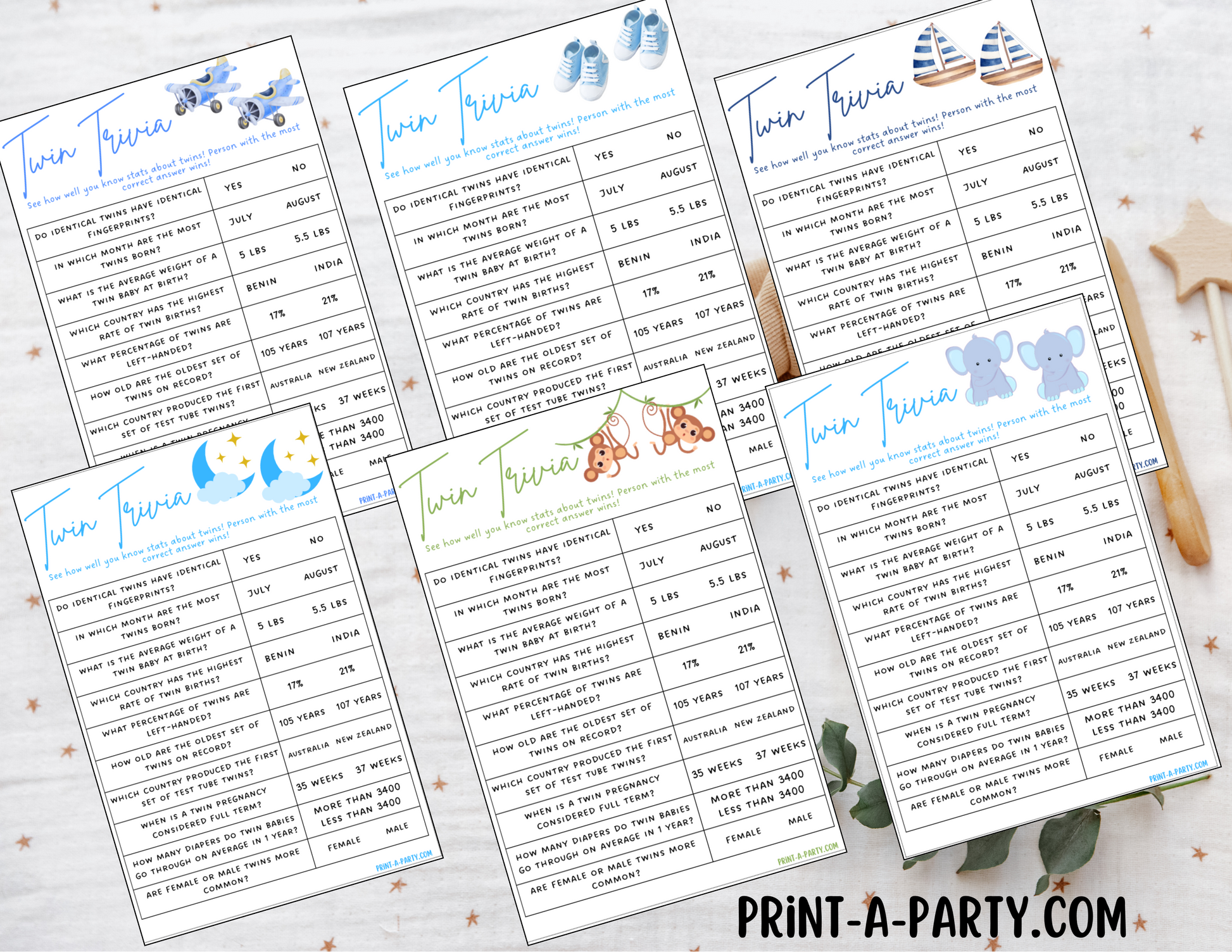 You are not seeing double - this is a perfect game for a Twin Boys Baby Shower, Twin Boys Baby Sprinkle, or twin party! Challenge your guests to guess the answers to intriguing facts about Twin Babies, while enjoying the convenience of easy print and play. Games print 2 per page on regular paper. Each game measures 5" x 7" each. Light dotted lines make it easy to cut out. Answer key included. Keep your guests entertained and engaged with this fun activity!