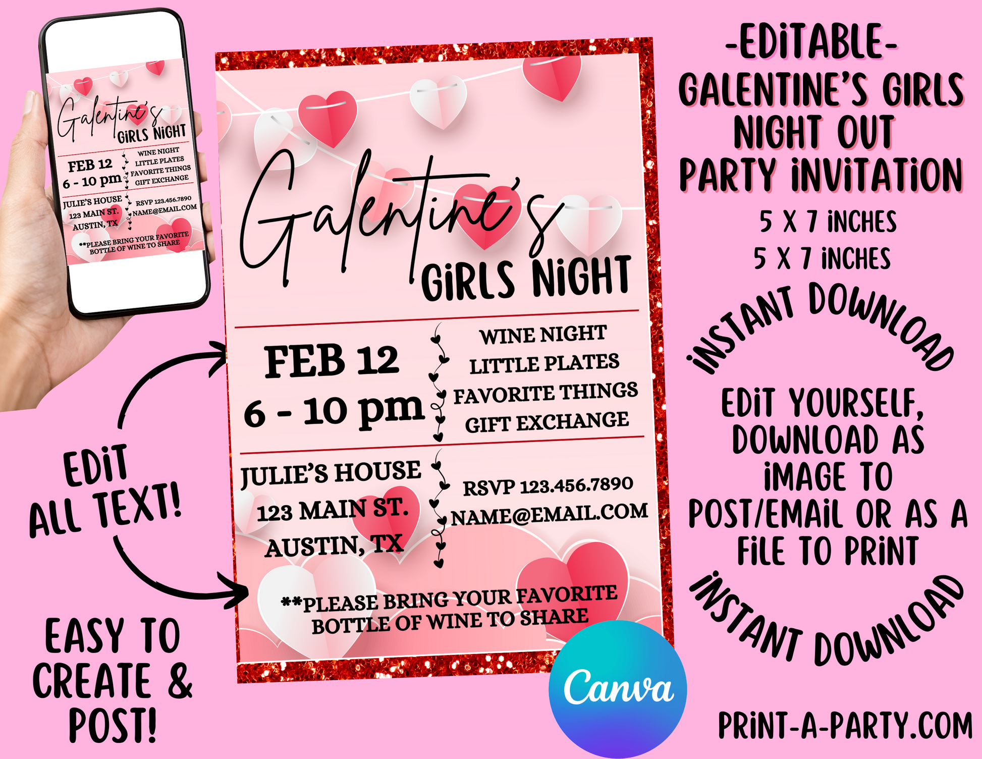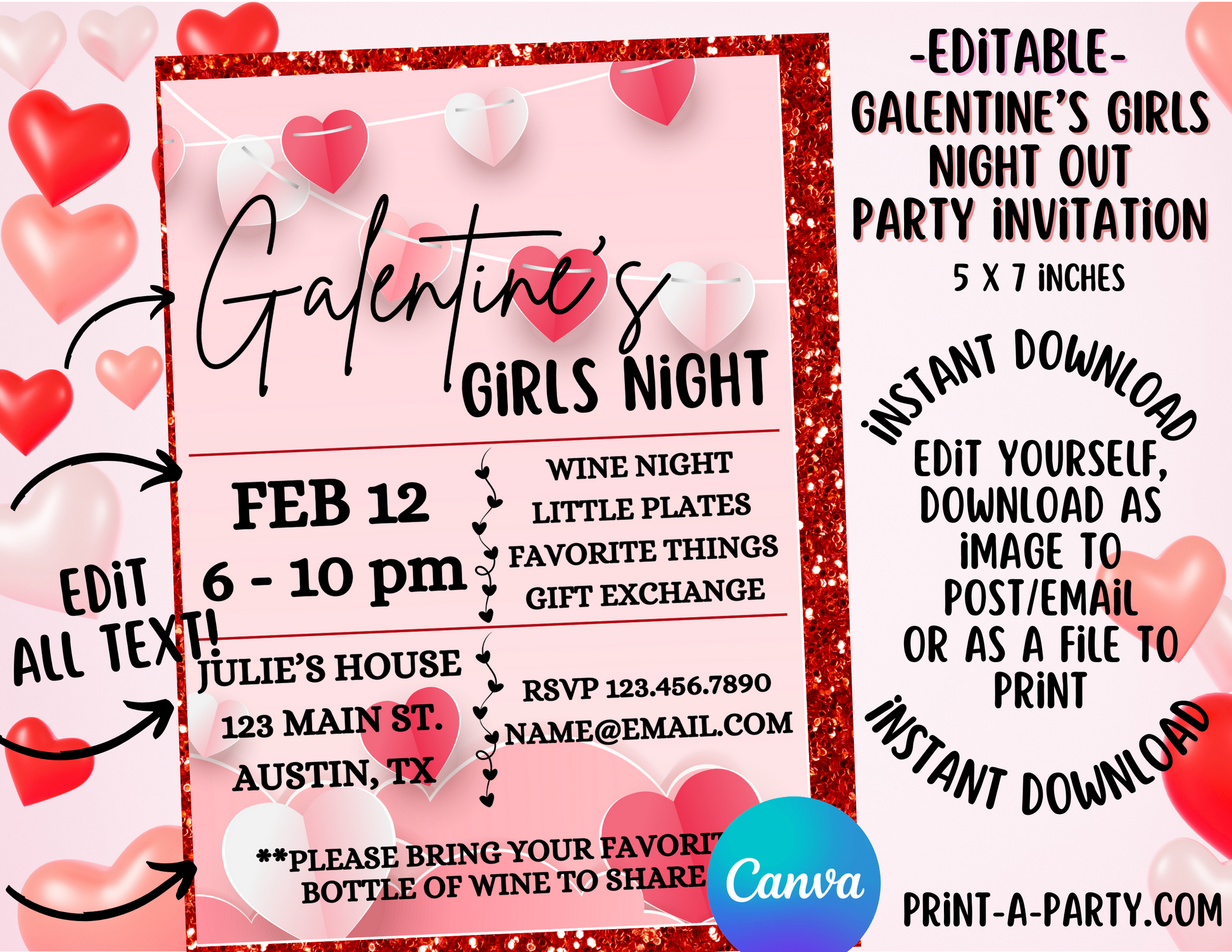 VALENTINE PARTY EDITABLE INVITATION: GALENTINES GIRLS WINE NIGHT INVITATION - EDITABLE PRINTABLE | Valentine's Day Party Invite | Valentine Party Customization | Valentine Wine Night