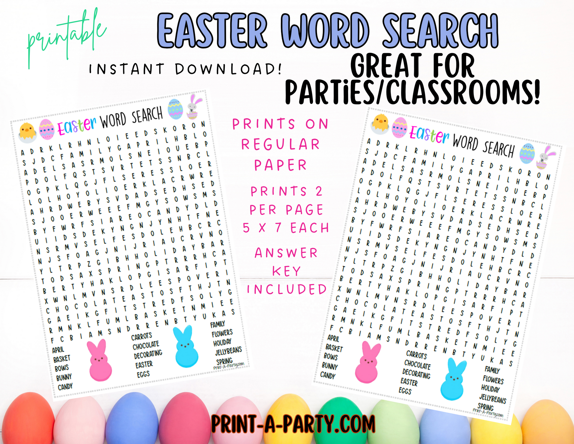 This Easter Word Search is a versatile addition for kids, classrooms, or parties. Ideal for teens/tweens as well. Enjoy searching for Easter-themed words with this one-page PDF printable. Simply print as many copies as you need on standard letter-size paper (8.5" x 11"). The two games per page (sized 5" x 7" each) are easy to cut out thanks to dotted lines. An answer key is also provided.